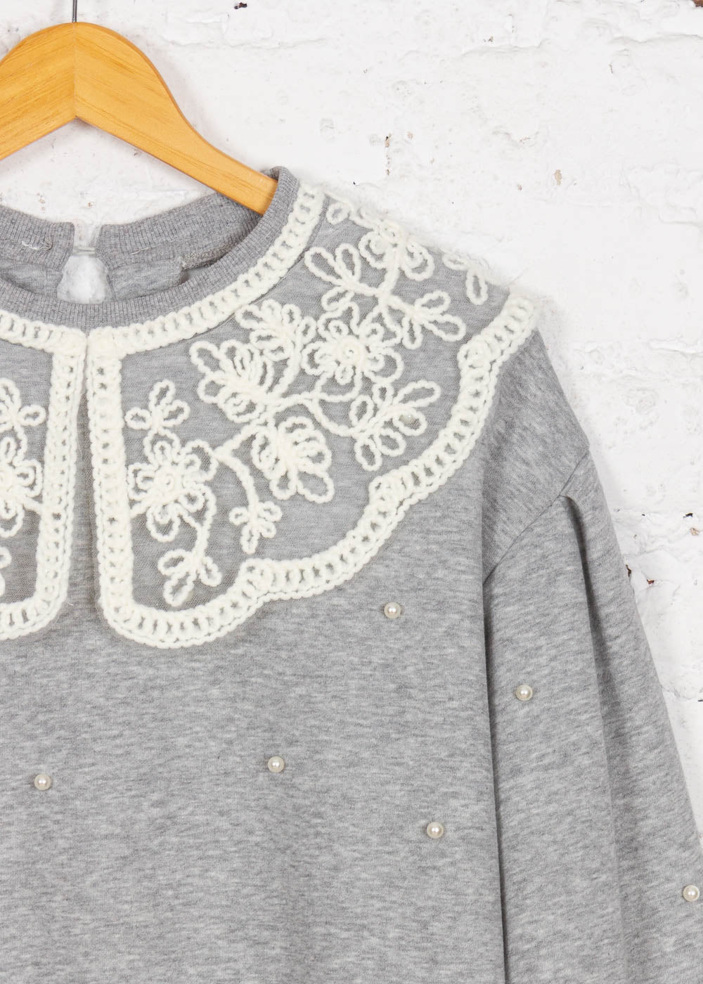 Bluza Elodie îmbină eleganța dantelei cu un stil modern. Mărgelele aplicate pe față și mâneci aduc strălucire discretă, iar gulerul supradimensionat din dantelă sparta creează un punct de atracție rafinat. Croiala relaxată și jerseul moale o fac confortabilă și ușor de purtat.