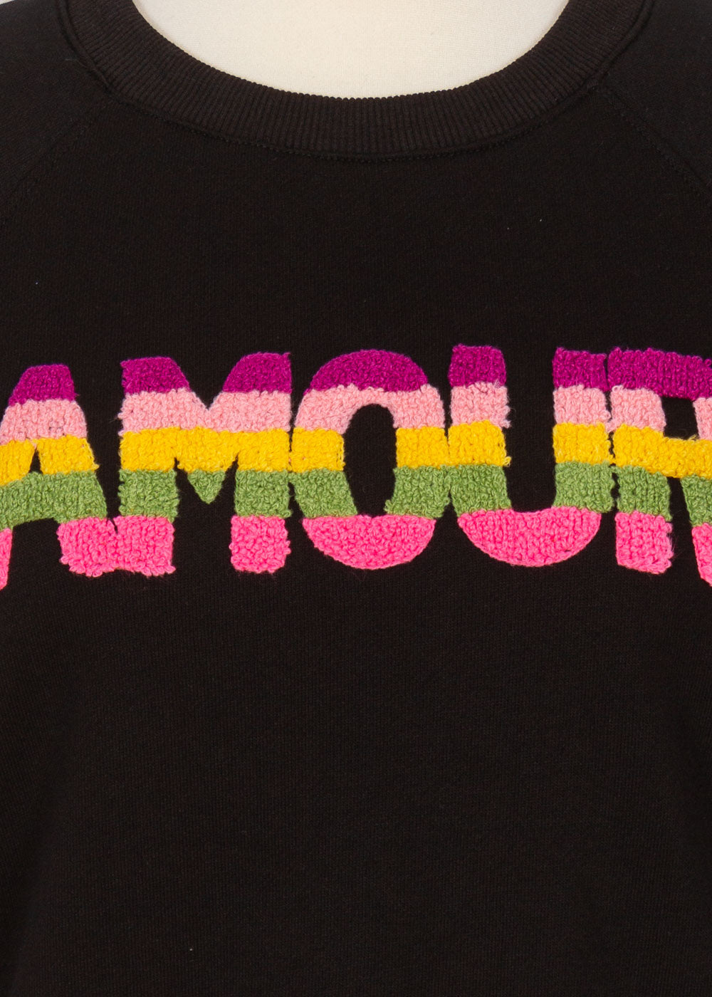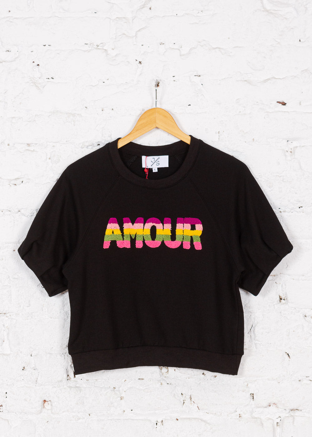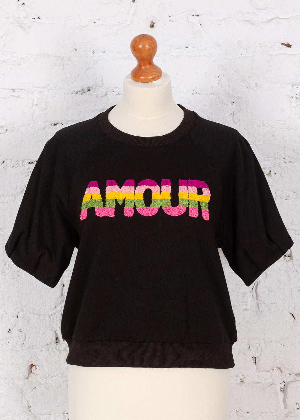 Descoperă bluza scurtă Claire cu maneci bufante, o expresie subtilă a eleganței și romantismului. Textul brodat "Amour" adaugă un farmec aparte, transformând fiecare ținută într-o declarație de stil și pasiune.