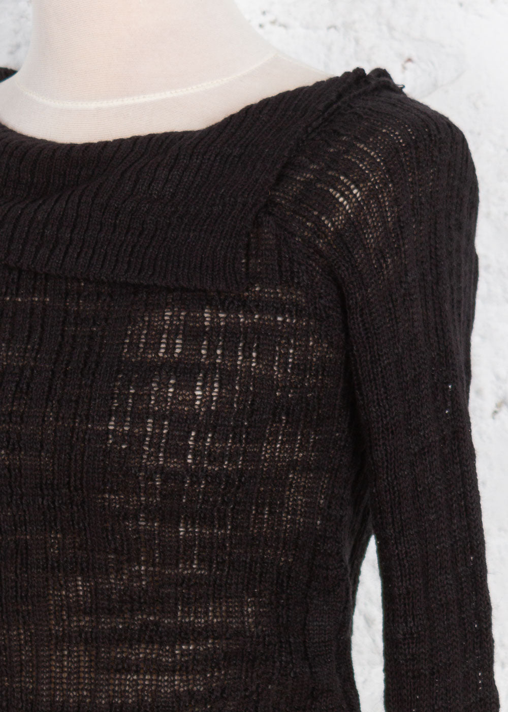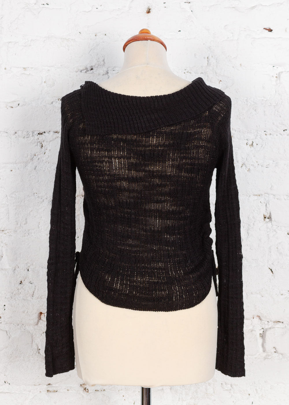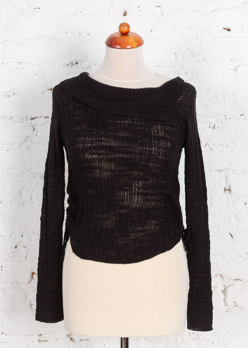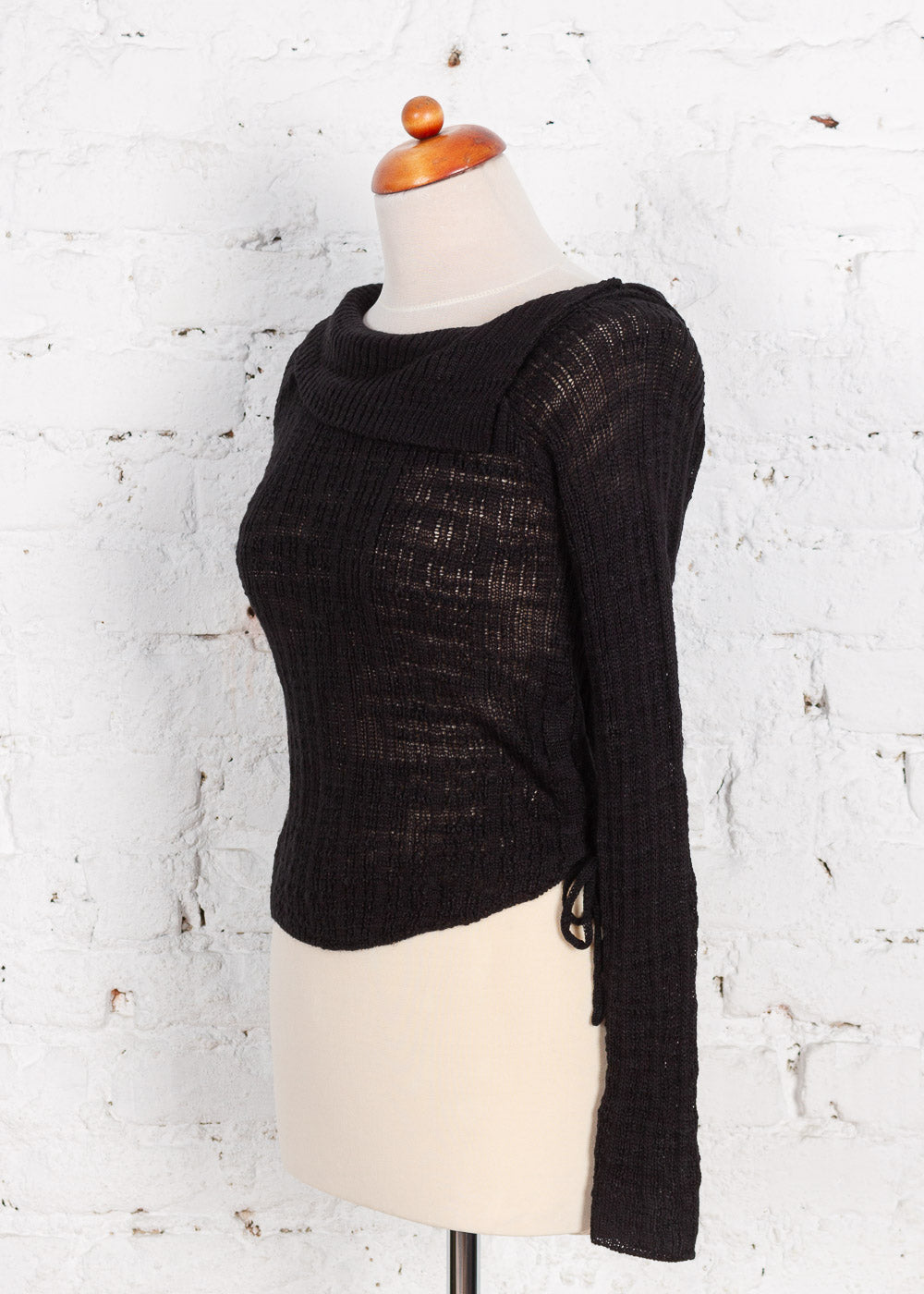Bluza tricotată neagră cu design modern și detalii subtile adaugă un aer sofisticat oricărei ținute. Materialul ușor transparent și reverul asimetric de la gulerul barcă îi conferă un plus de originalitate, iar șireturile laterale permit ajustarea lungimii pentru un look personalizat.