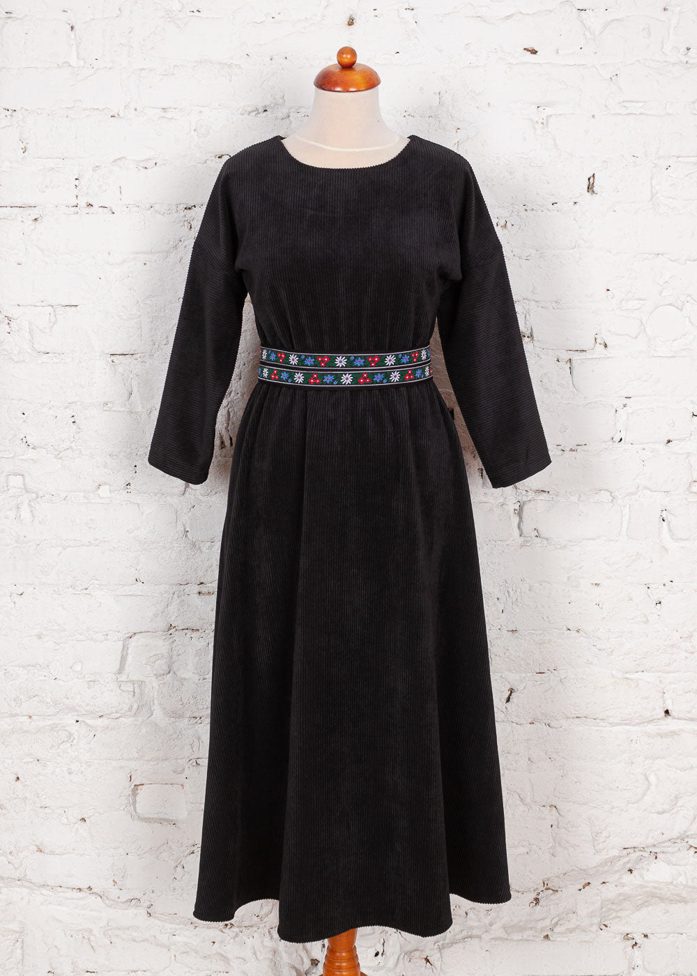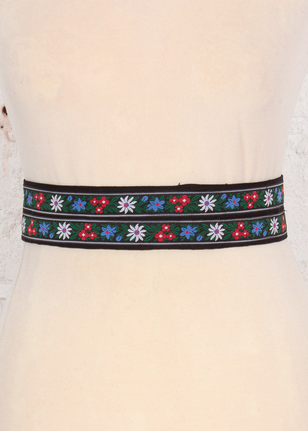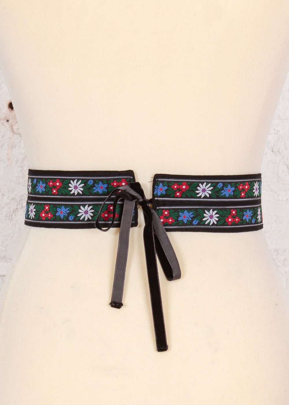 Un accesoriu care completează perfect orice ținută cu accente boeme sau tradiționale. Brâul are suport din bumbac negru, se leagă la spate cu șireturi reglabile și este disponibil în două variante decorative: una cu motive florale și alta cu motive geometrice.