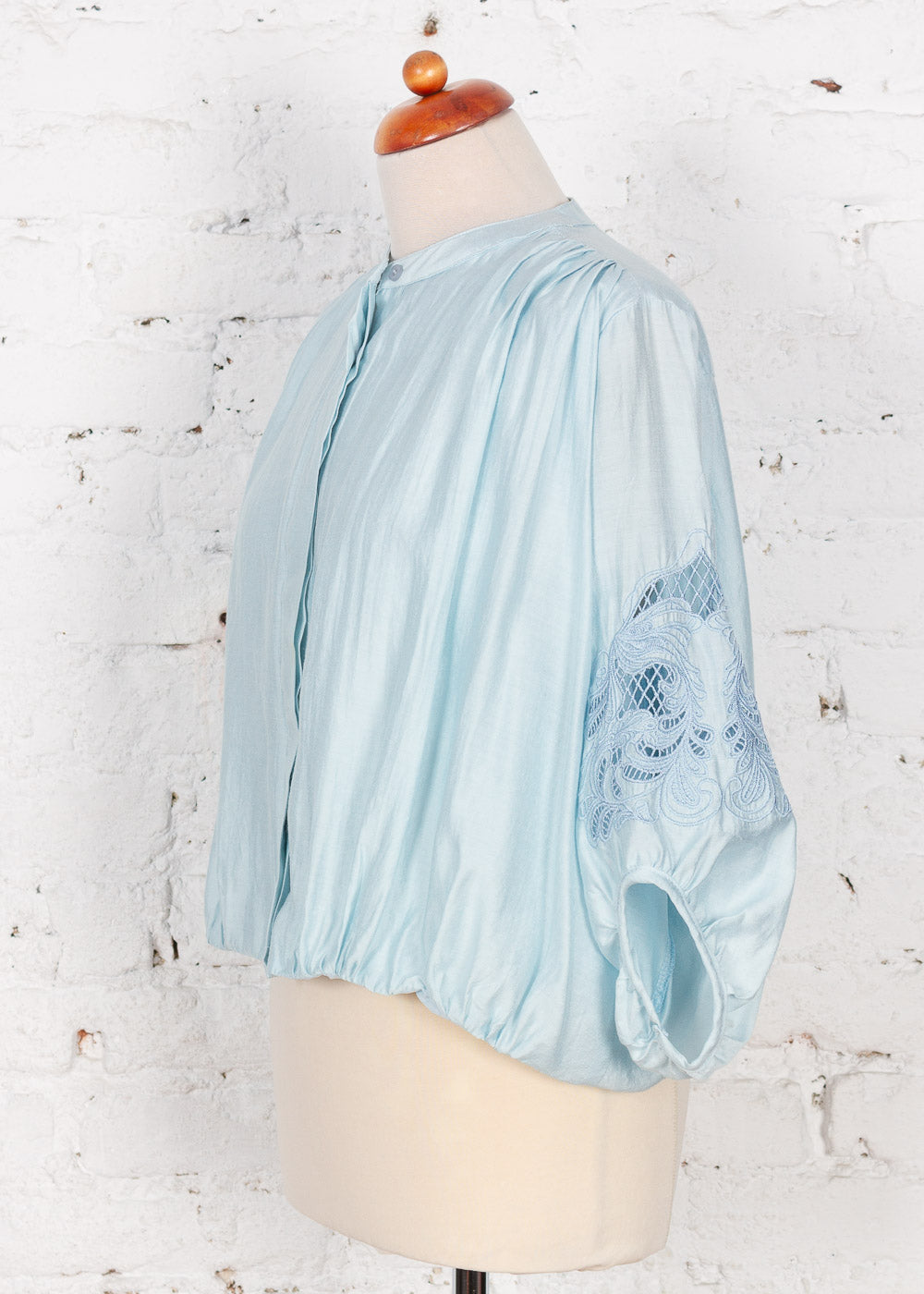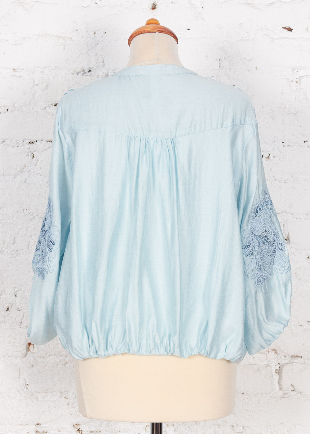 - Mâneci 3/4 bufante, decorate cu o broderie spartă sofisticată.