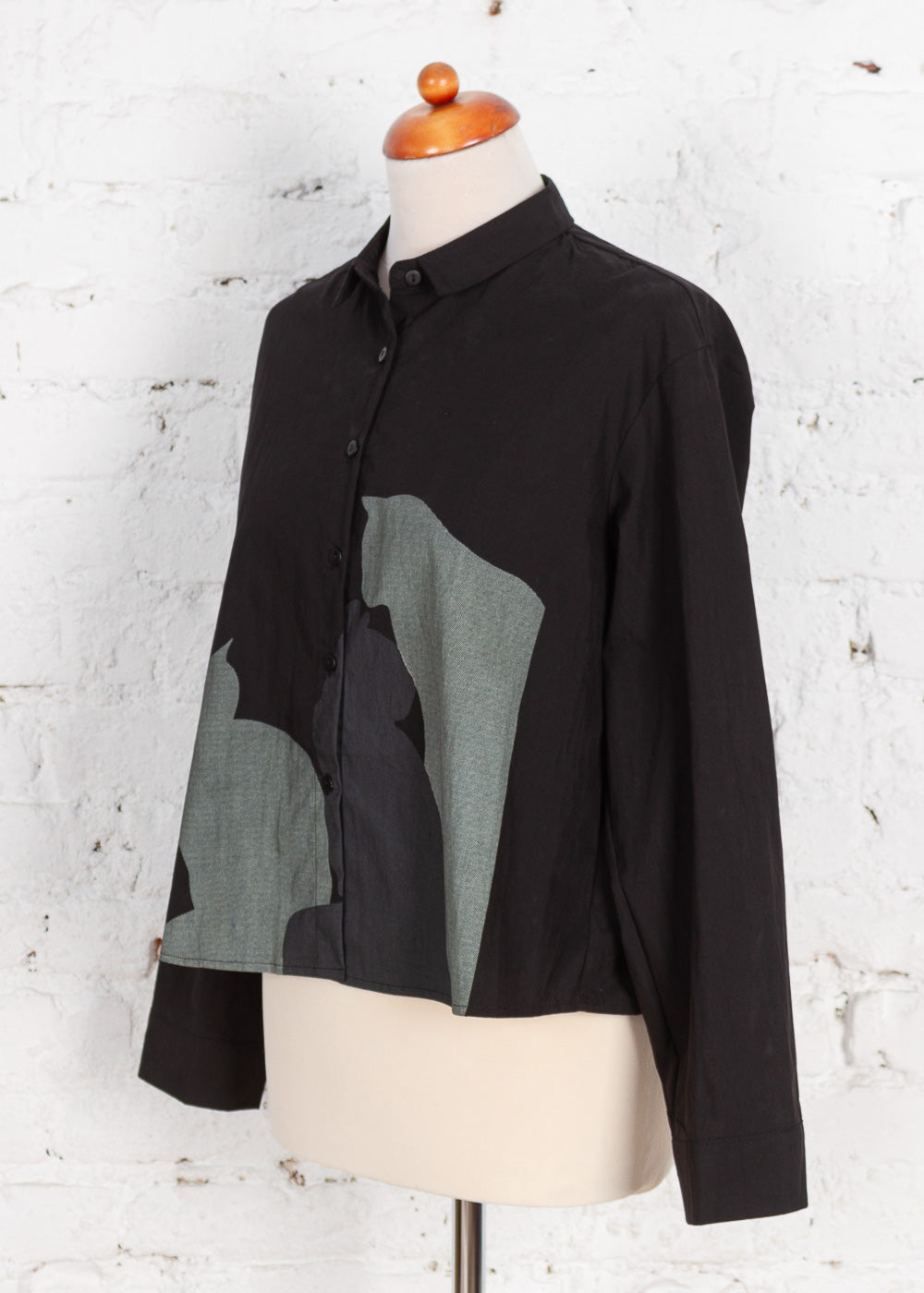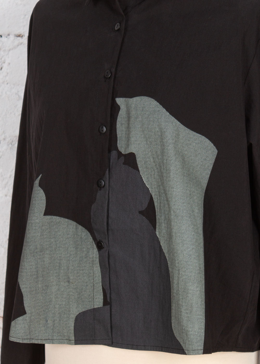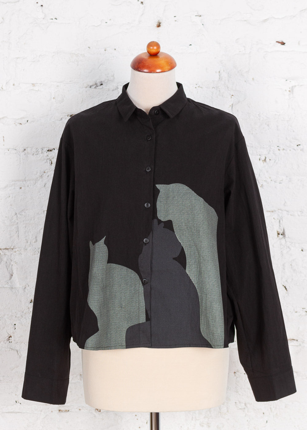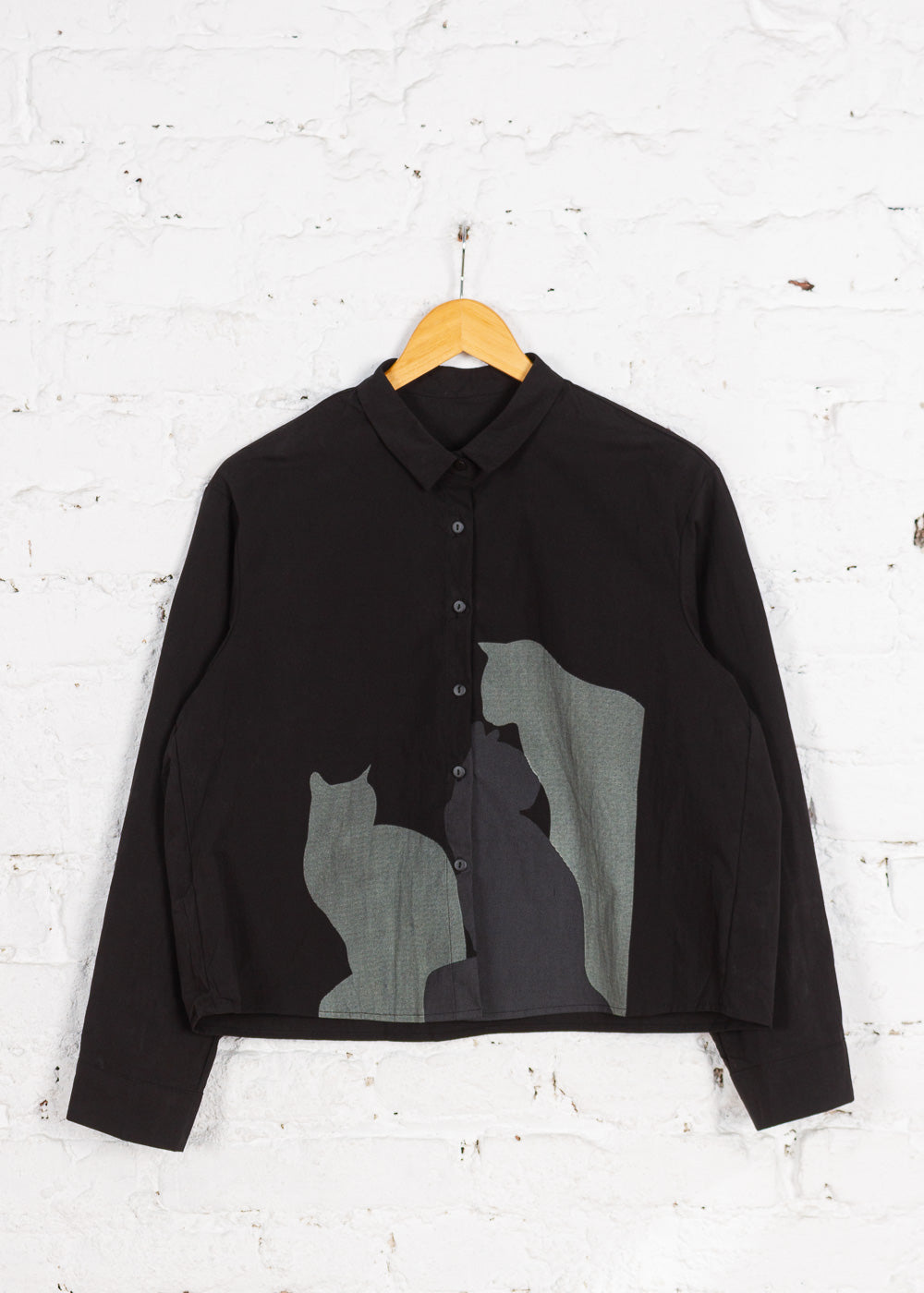Această cămașă neagră cu croială boxy fit aduce un plus de originalitate prin imprimeul cu siluete de pisici în partea de jos. Realizată dintr-un mix confortabil de bumbac și poliester, cămașa este lejeră, versatilă și ideală pentru un look casual, dar cu personalitate.