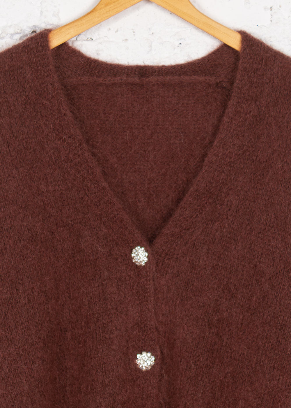 Acest cardigan deosebit, cu mohair și lână în compoziție, este alegerea ideală pentru zilele răcoroase, oferindu-ți confort și un stil relaxat. Cu o croială lejeră și nasturi eleganți decorați cu pietricele, acest cardigan adaugă un plus de rafinament oricărei ținute. Este disponibil într-o gamă variată de culori și este creat pentru a fi purtat cu ușurință în orice combinație vestimentară.