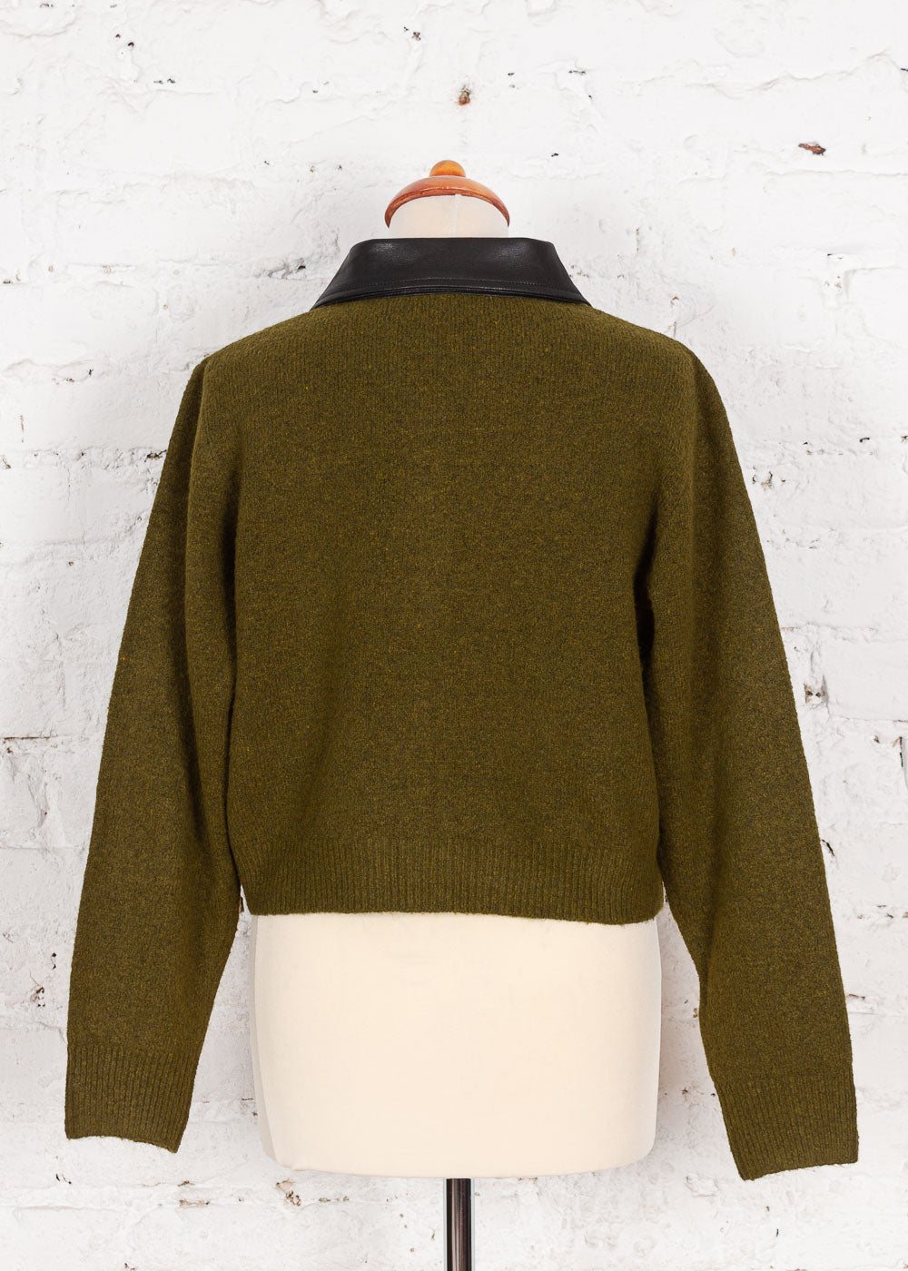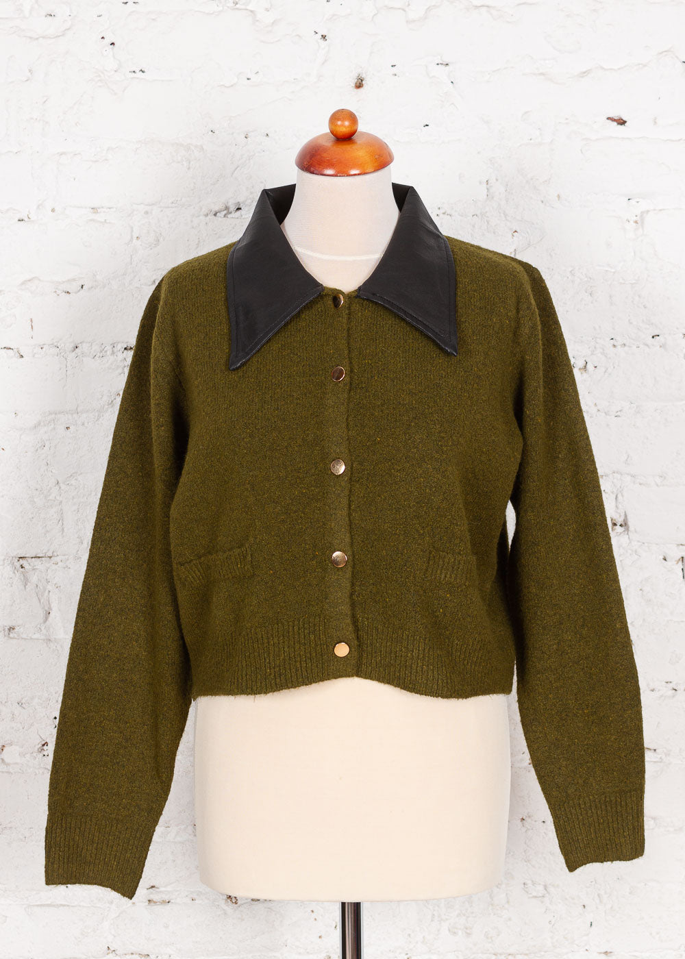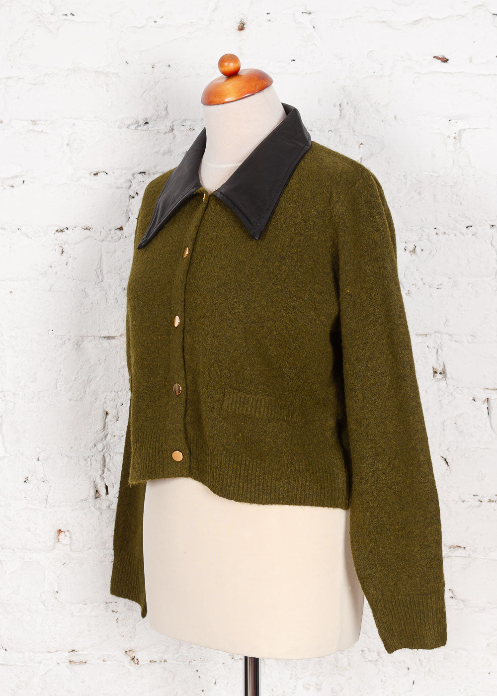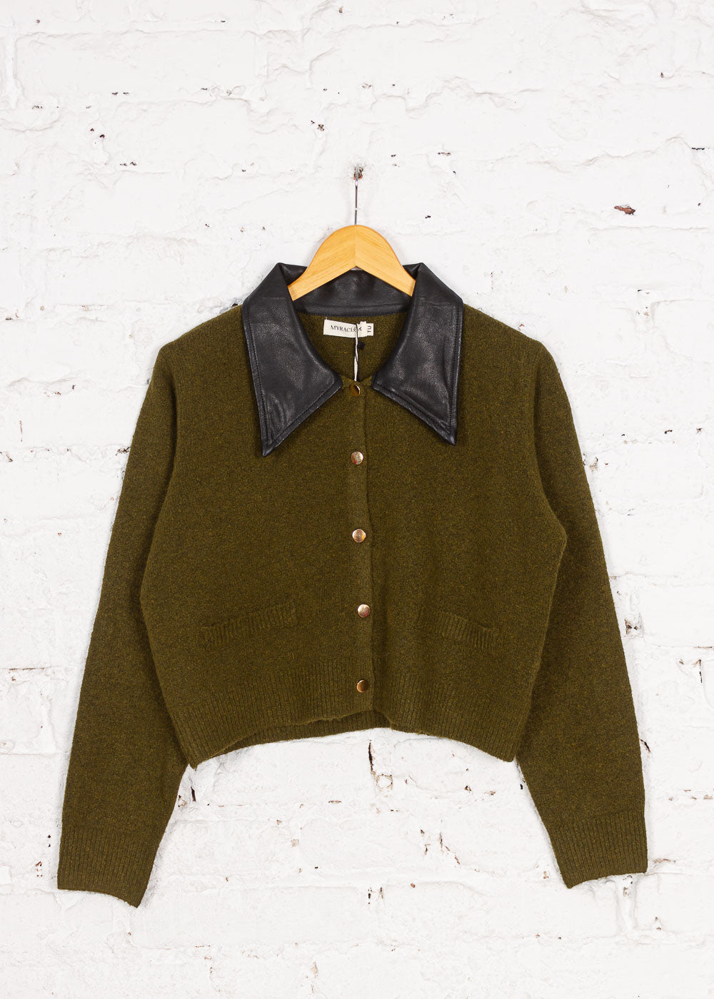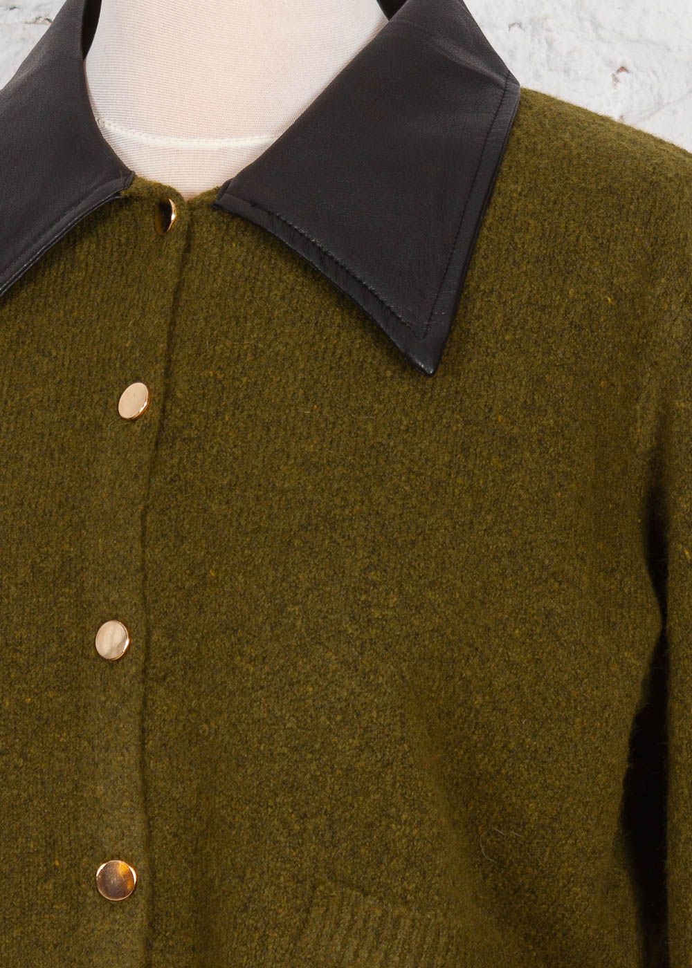 Cardiganul din tricot kaki este piesa perfectă pentru un look modern cu accente rafinate. Cu o croială ușor crop și detalii contrastante din piele ecologică, aduce o notă de eleganță casual ideală pentru sezonul rece. Designul versatil și textura moale îl fac ușor de integrat în diverse ținute.