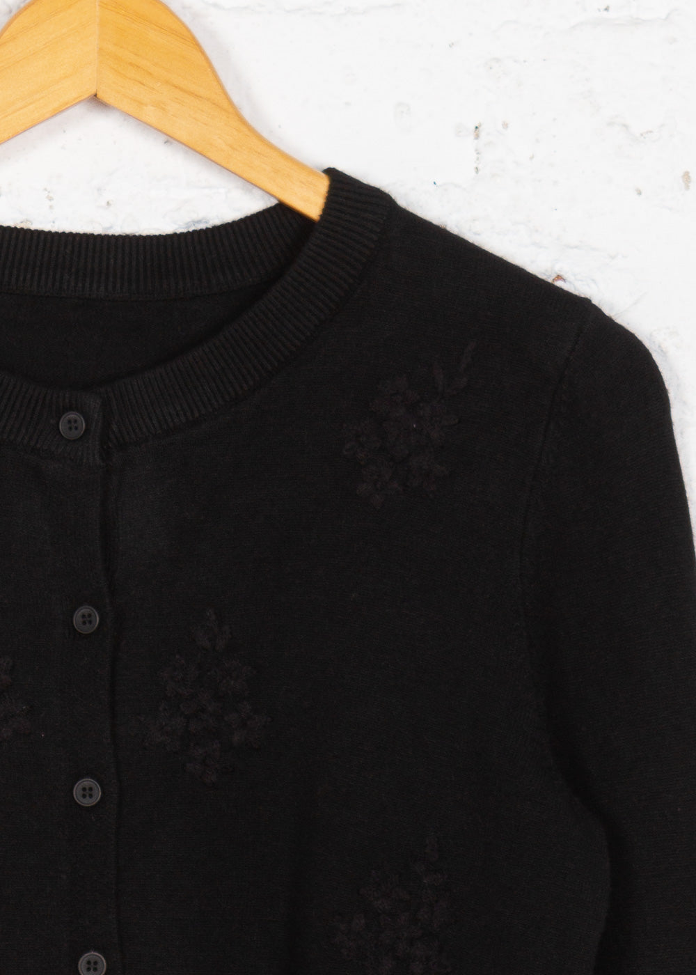 Acest cardigan delicat din tricot cu model floral pe față adaugă un aer feminin și elegant oricărei ținute. Gulerul rotund și închiderea cu nasturi îl fac versatil și ușor de purtat, fiind alegerea perfectă pentru zilele răcoroase.