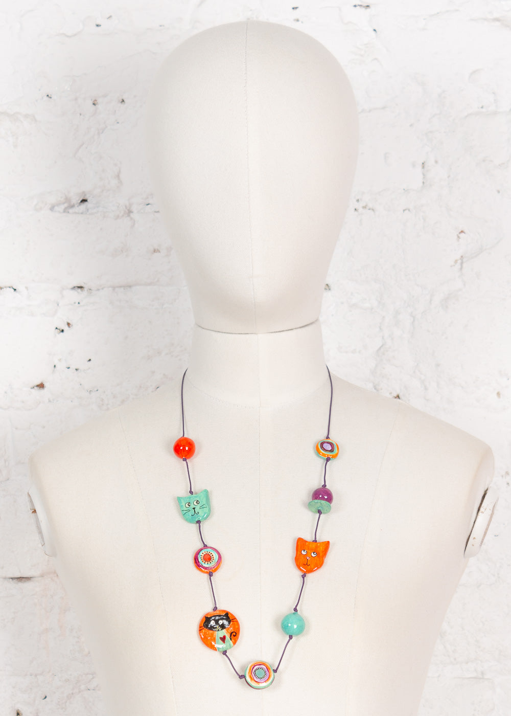 Acest colier încântător este o expresie a creativității și măiestriei artizanale, fiind realizat din piese de ceramică lucrate și pictate manual. Fiecare piesă are forme unice și jucăușe, cum ar fi pisici, fructe și ciuperci, fiind decorate cu motive inspirate din natură și culori vibrante. Un accesoriu perfect pentru cei care iubesc detaliile unice și stilul original, colierul adaugă o notă de veselie oricărei ținute.