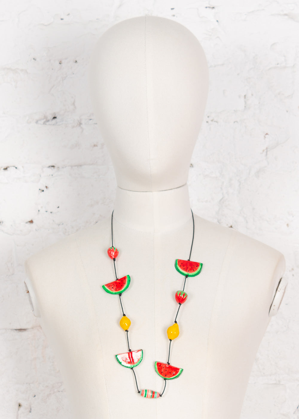 Acest colier încântător este o expresie a creativității și măiestriei artizanale, fiind realizat din piese de ceramică lucrate și pictate manual. Fiecare piesă are forme unice și jucăușe, cum ar fi pisici, fructe și ciuperci, fiind decorate cu motive inspirate din natură și culori vibrante. Un accesoriu perfect pentru cei care iubesc detaliile unice și stilul original, colierul adaugă o notă de veselie oricărei ținute.