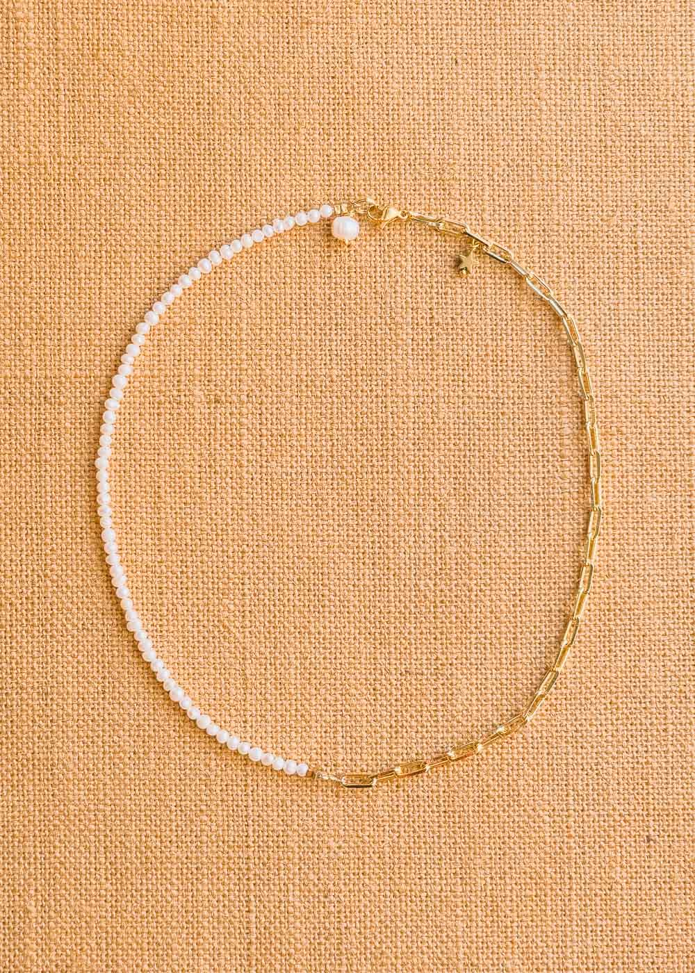 Acest colier este realizat manual în atelierul nostru, îmbinând armonios perle de cultură, pietre semiprețioase și elemente ceramice, toate montate pe un fir rezistent din inox siliconat. Încuierea din argint aurit adaugă un plus de rafinament, transformând fiecare colier într-o piesă unică, perfectă pentru orice ocazie.