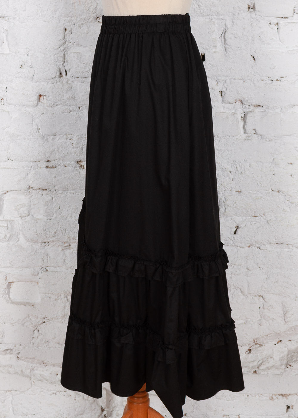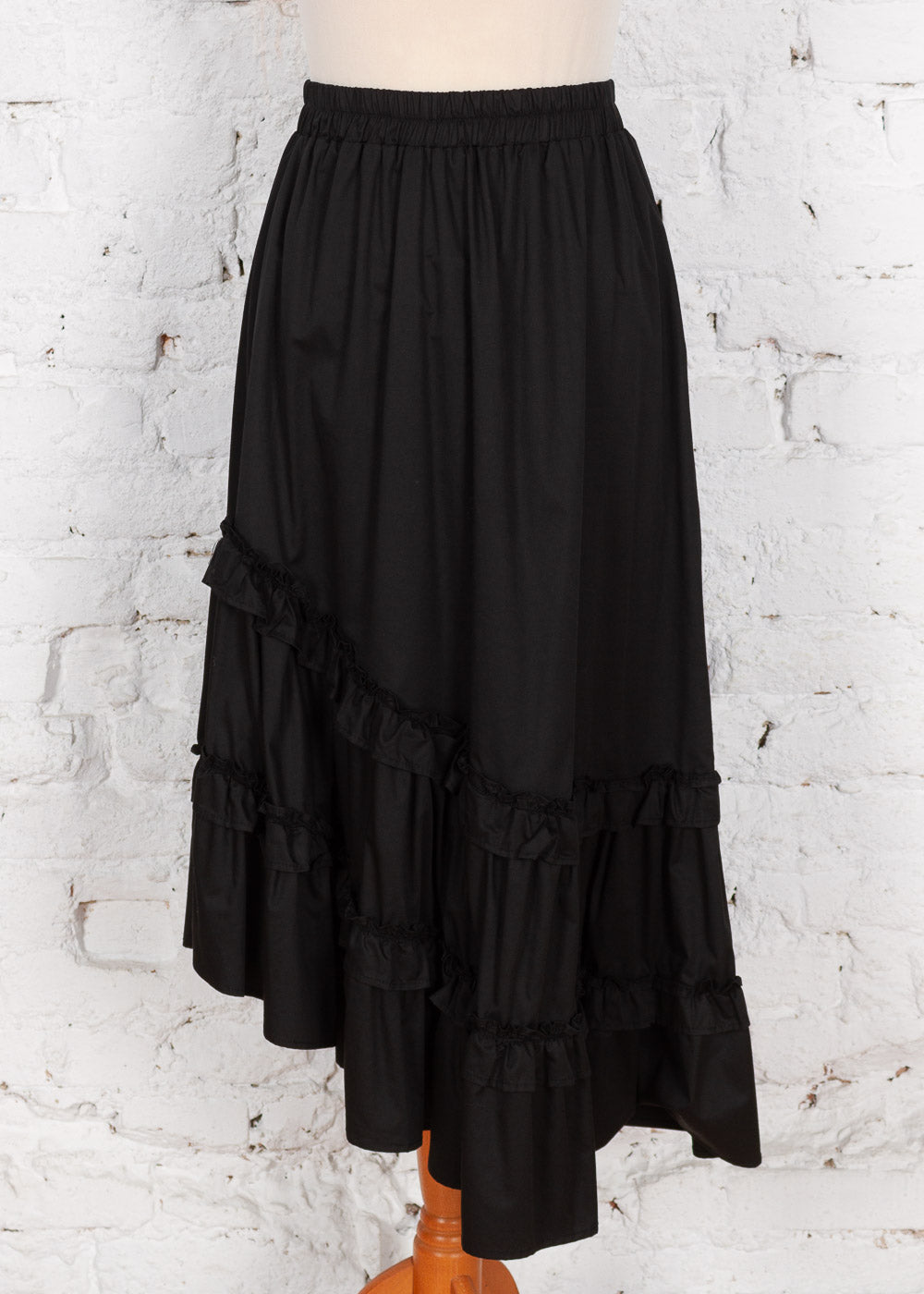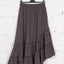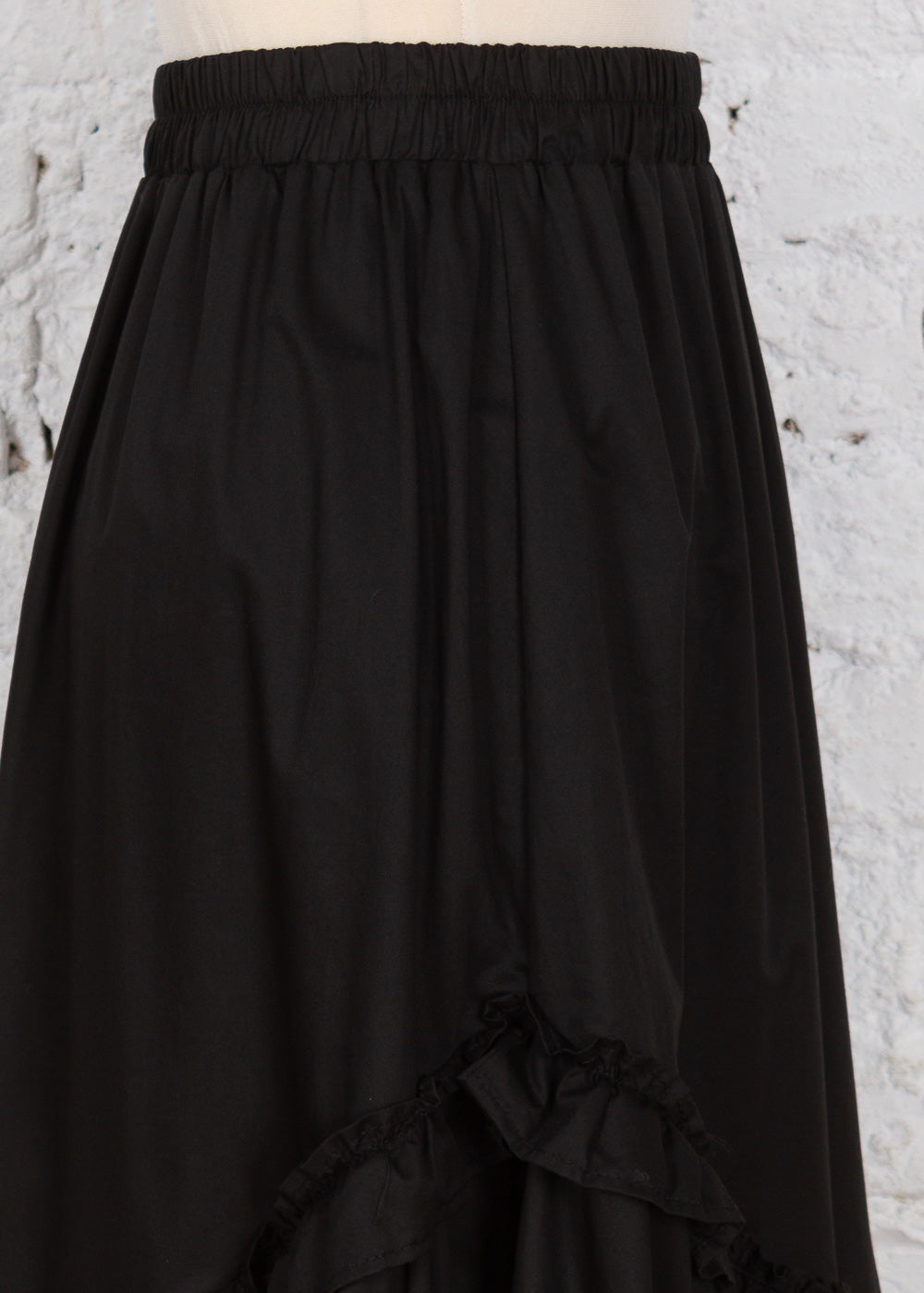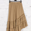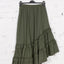 Adaugă o notă de originalitate garderobei tale cu această fustă midi asimetrică. Confecționată dintr-un bumbac moale și ușor elastic, piesa se remarcă prin volanele delicate de la terminație care oferă volum și fluiditate în mișcare. Talia elastică garantează o potrivire perfectă, fiind ideală pentru ținute casual-chic pline de stil.