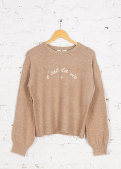 Pulover cu lână și text brodat Eloise bej