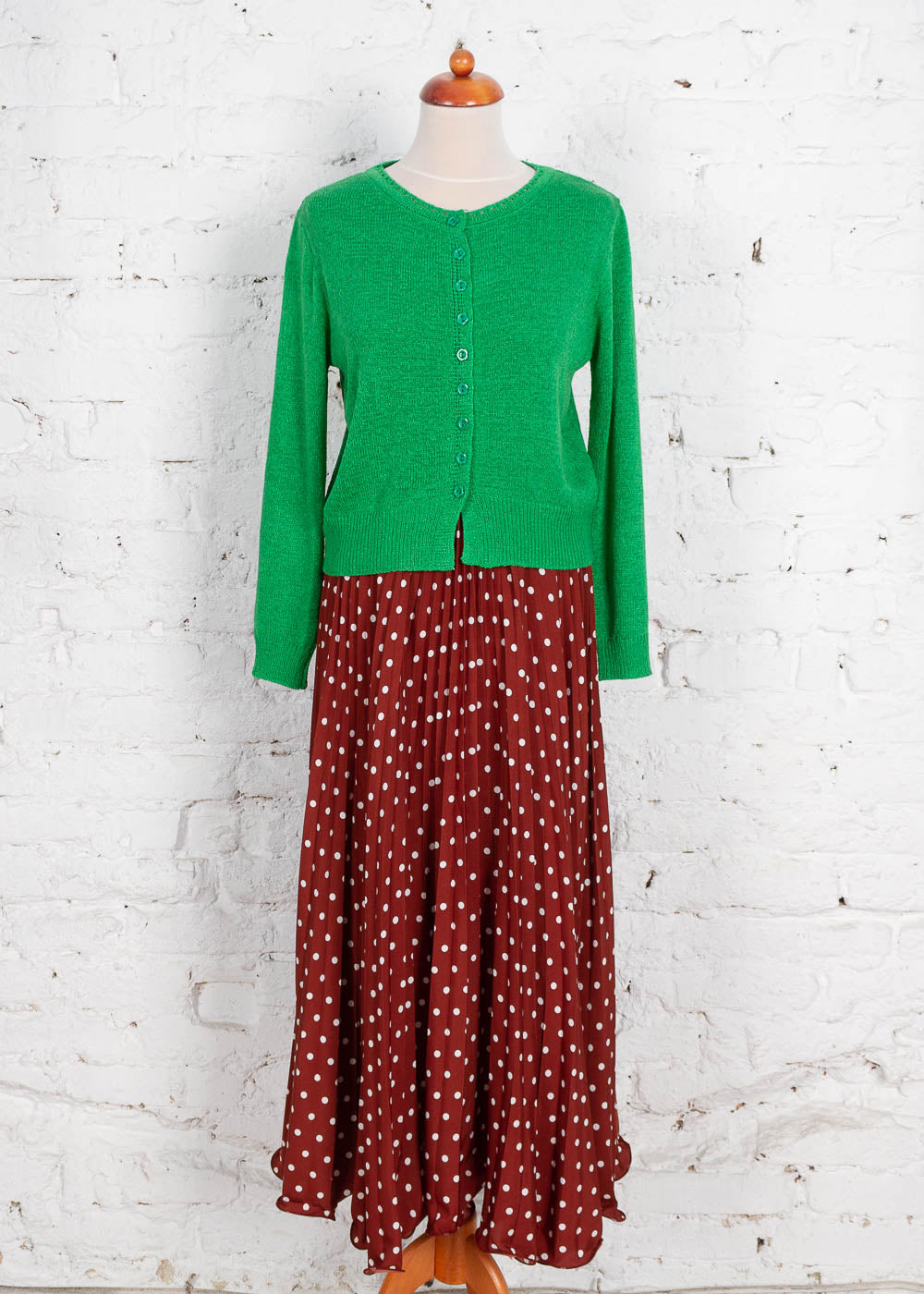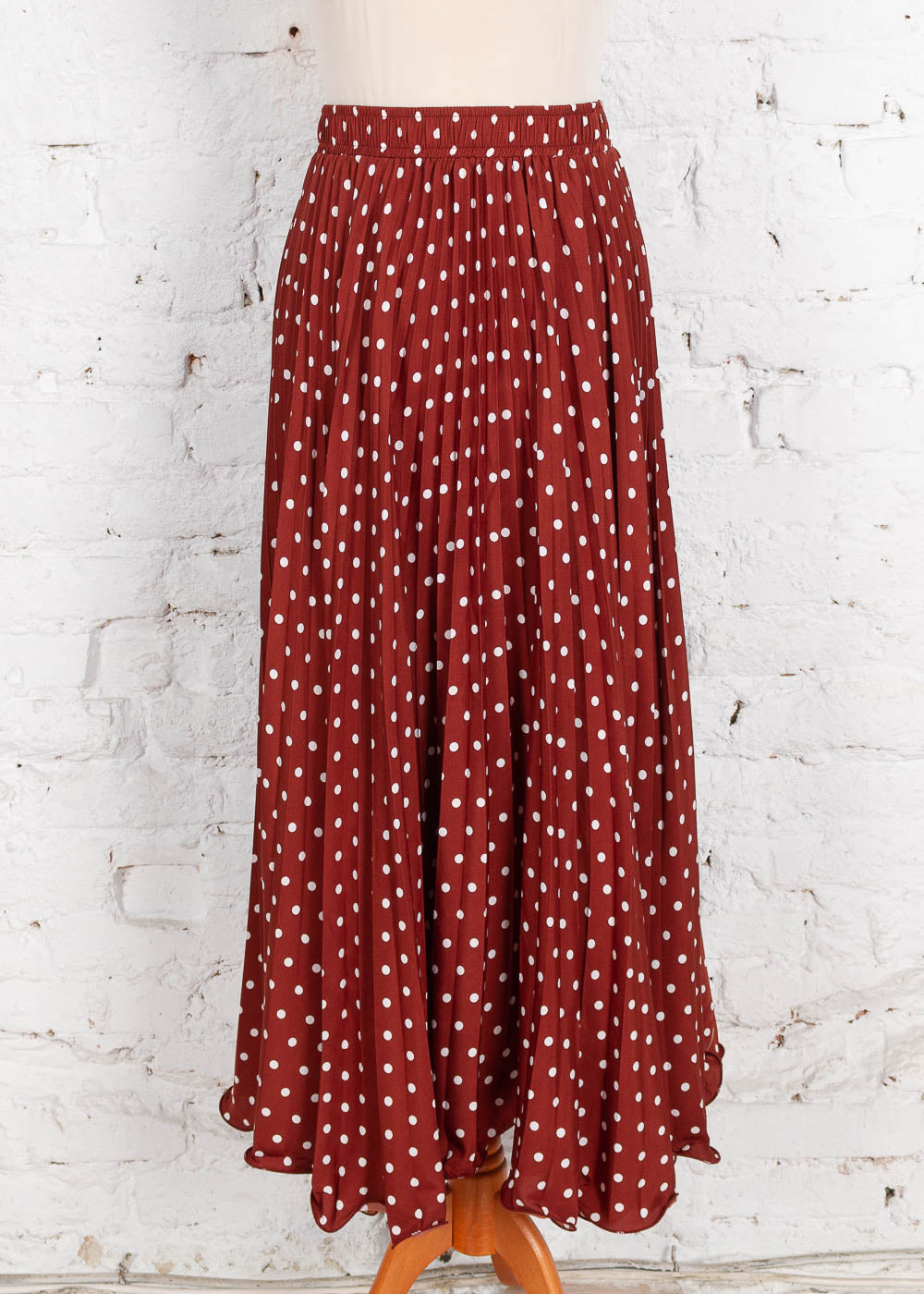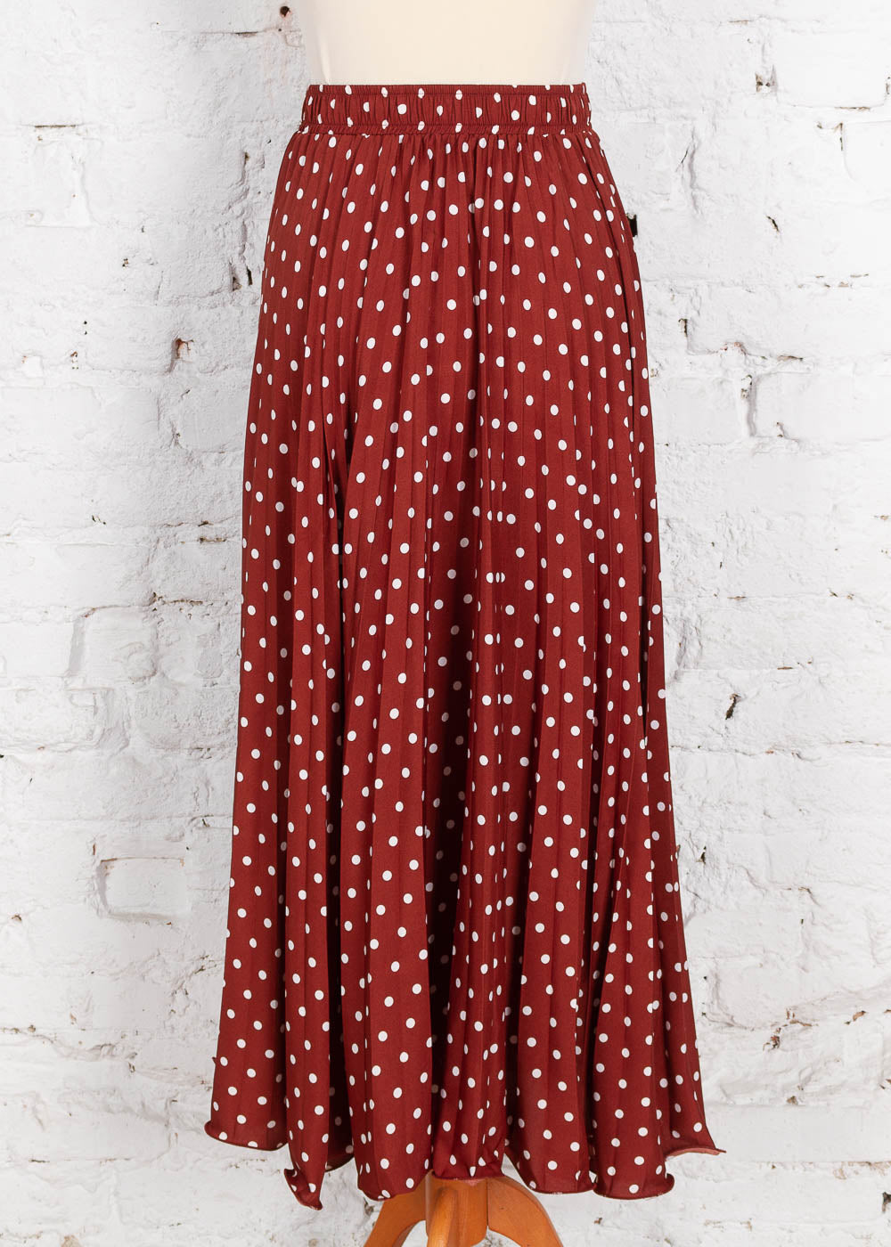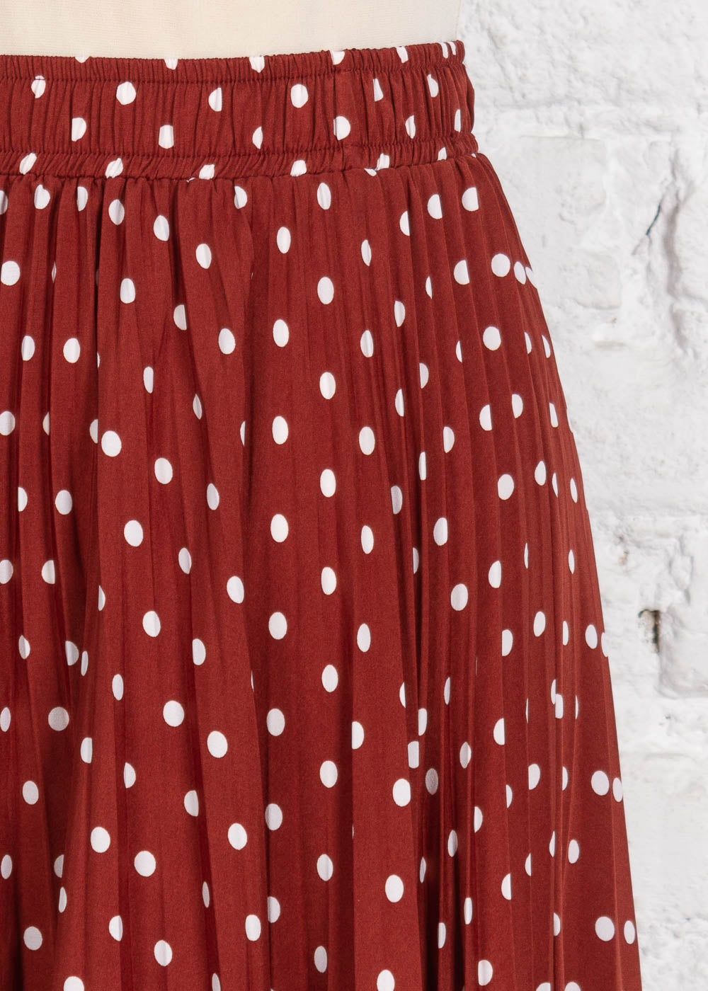 Această fustă plisată midi îmbină confortul cu eleganța lejeră, fiind ideală pentru ținute casual sau office. Talia elastică și tivul întărit îi conferă o ținută aparte, iar imprimeul cu buline adaugă un aer jucăuș și feminin.