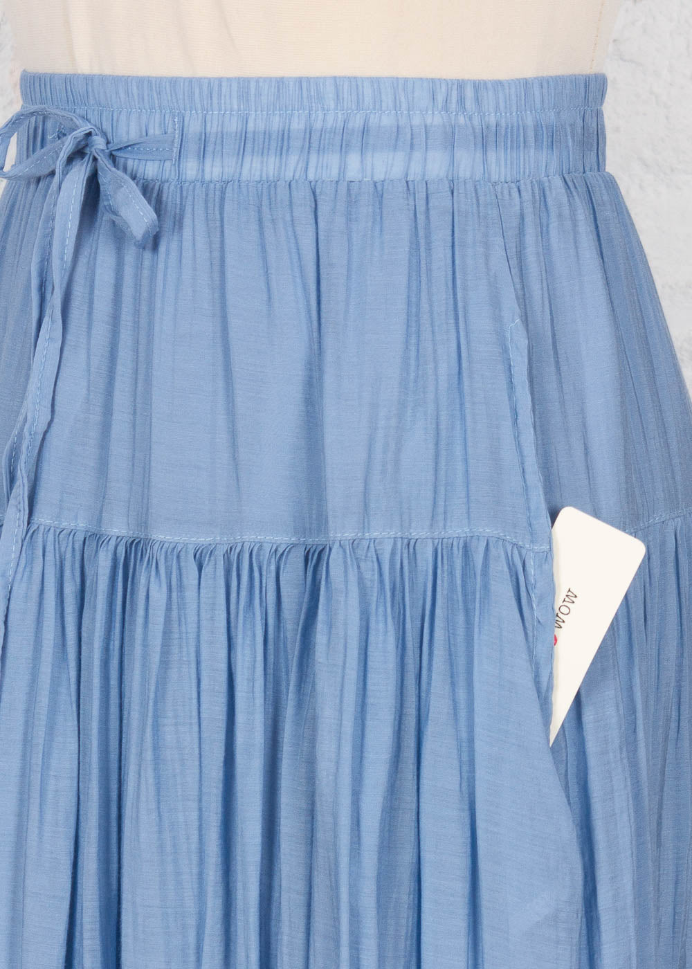 Această fustă midi cu volane este piesa ideală pentru o garderobă feminină și relaxată. Realizată dintr-un material delicat, oferă un confort sporit datorită taliei elastice prevăzute cu șiret. Designul fluid și detaliile practice, precum buzunarele ascunse, o transformă într-o alegere versatilă pentru orice moment al zilei.