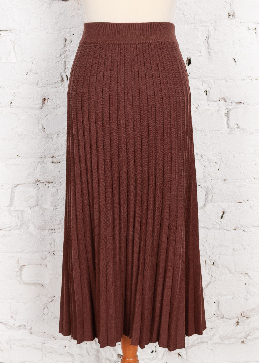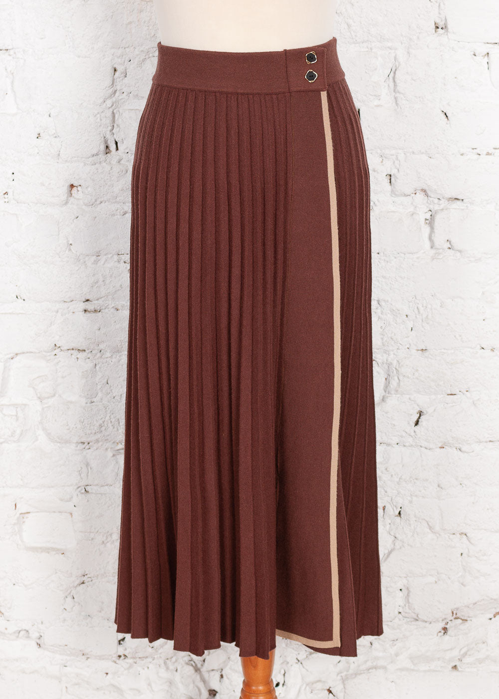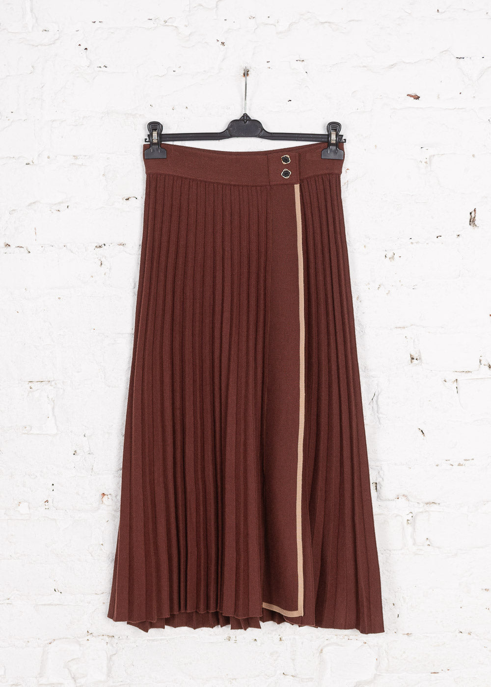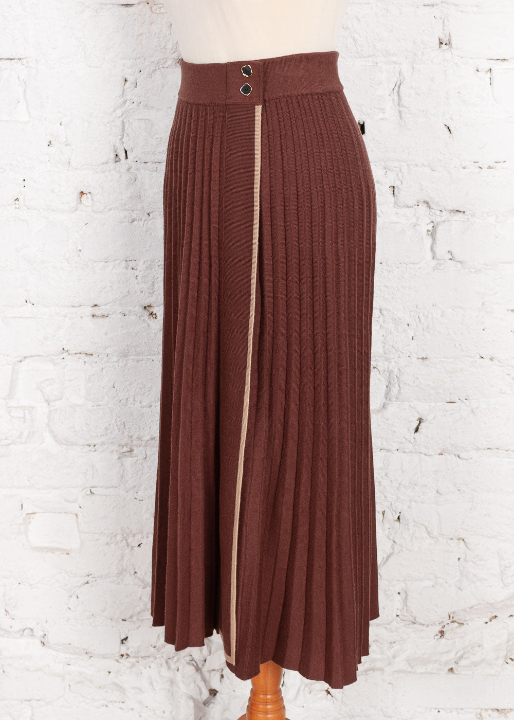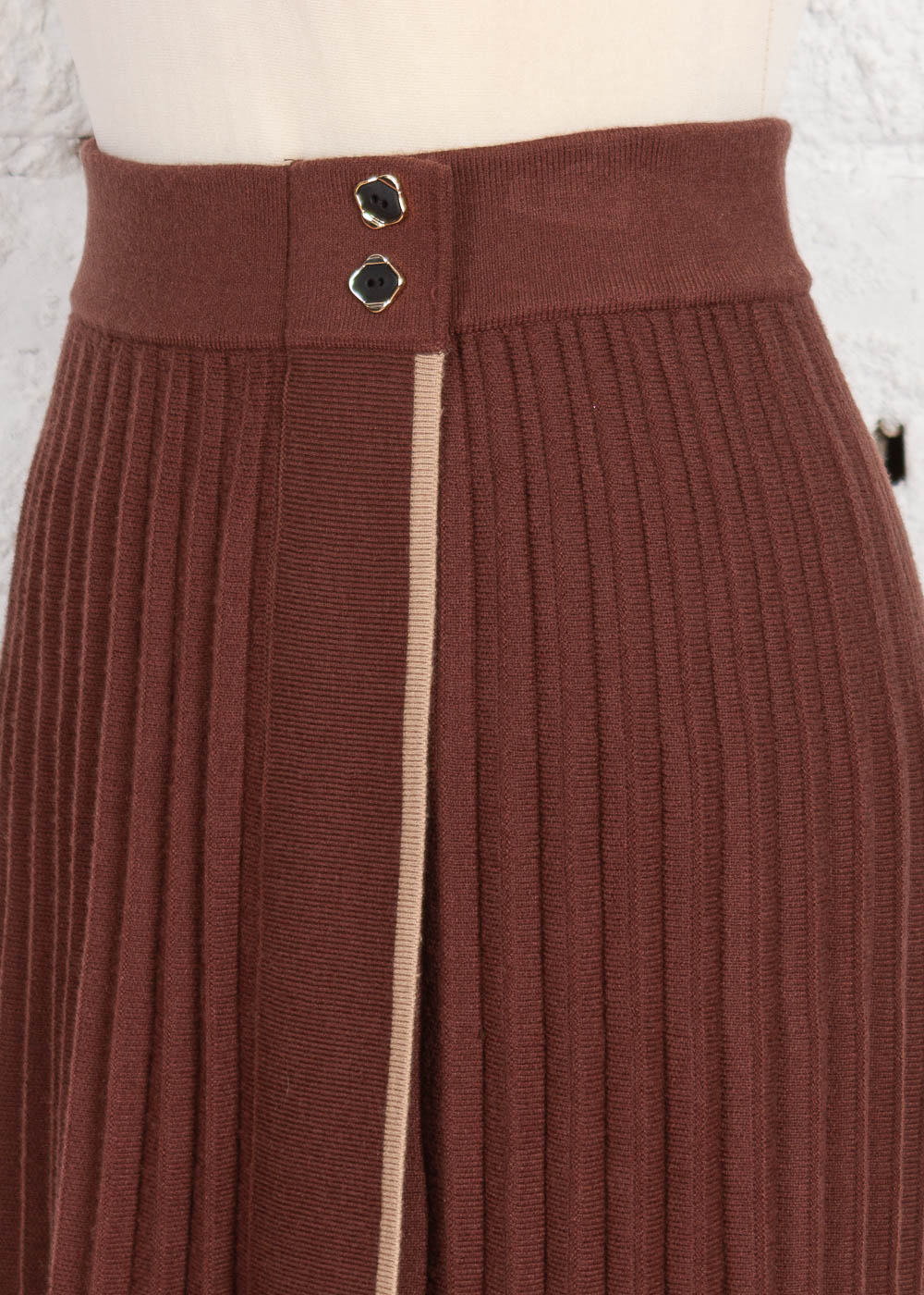 Această fustă midi din tricot îmbină confortul cu eleganța minimalistă. Plisarea fluidă și detaliul lateral cu pliu contrastat îi oferă un aer modern, ușor sofisticat. Versatilă și ușor de integrat în garderobă, se potrivește atât pentru office, cât și pentru ținute casual-chic.