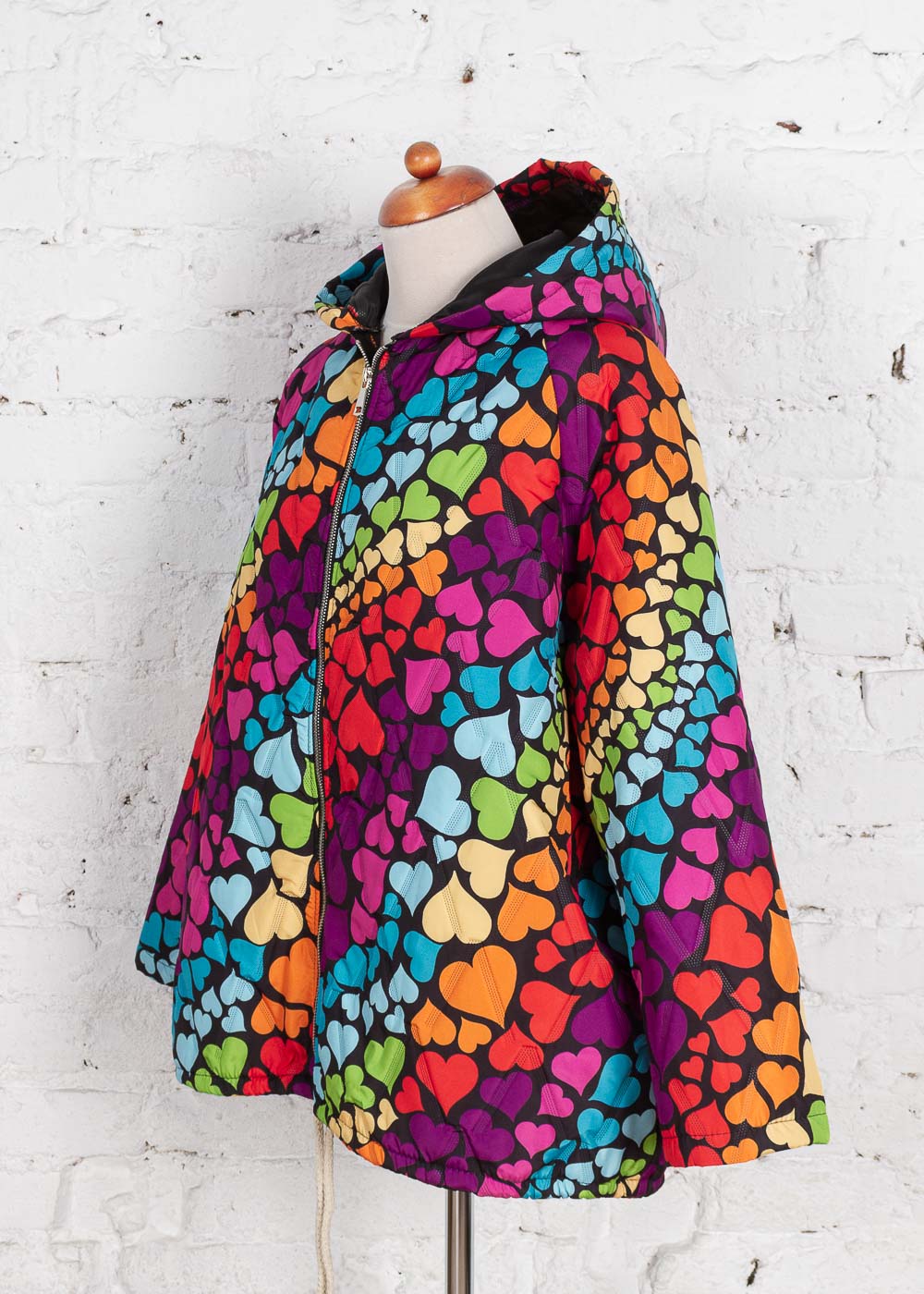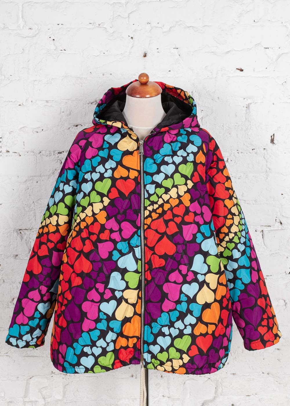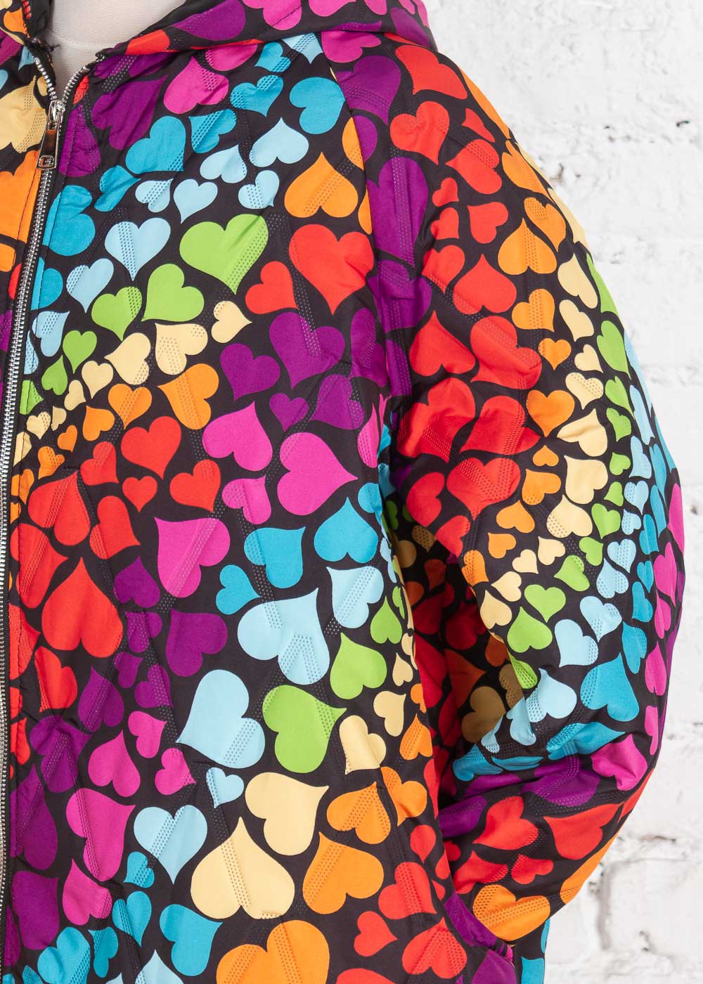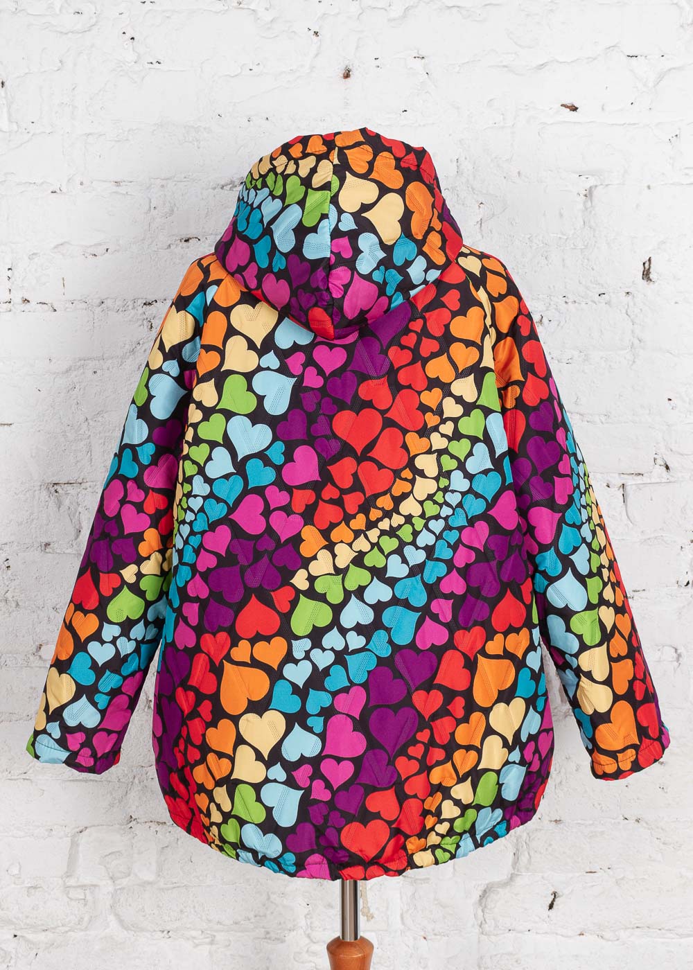 Această jachetă matlasată cu glugă atașată îmbină confortul cu stilul vesel. Imprimeul cu inimioare în culorile curcubeului aduce o notă ludică, iar croiala largă oferă libertate de mișcare. Este ideală pentru zilele răcoroase și poate transforma instant orice ținută într-una plină de personalitate.