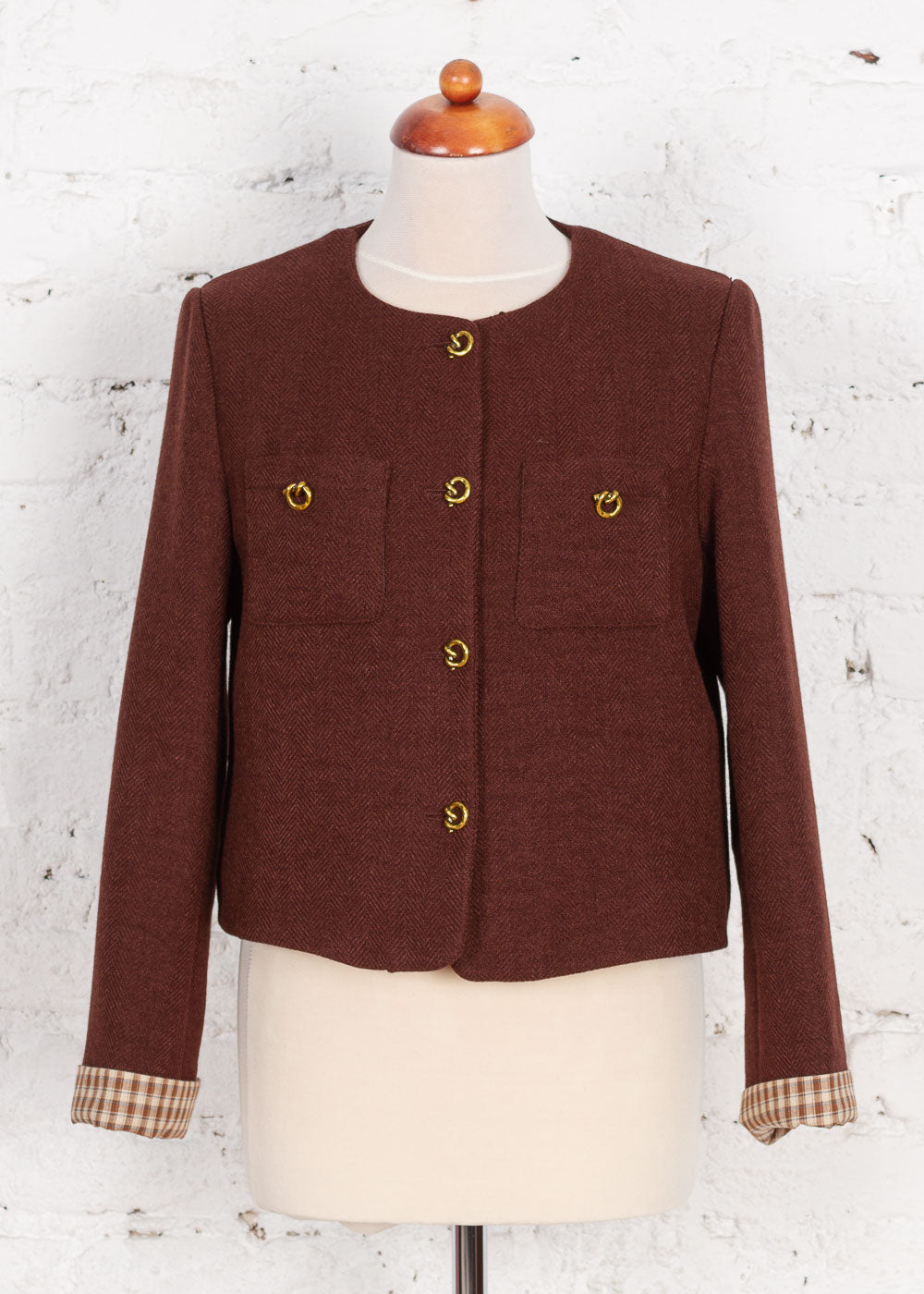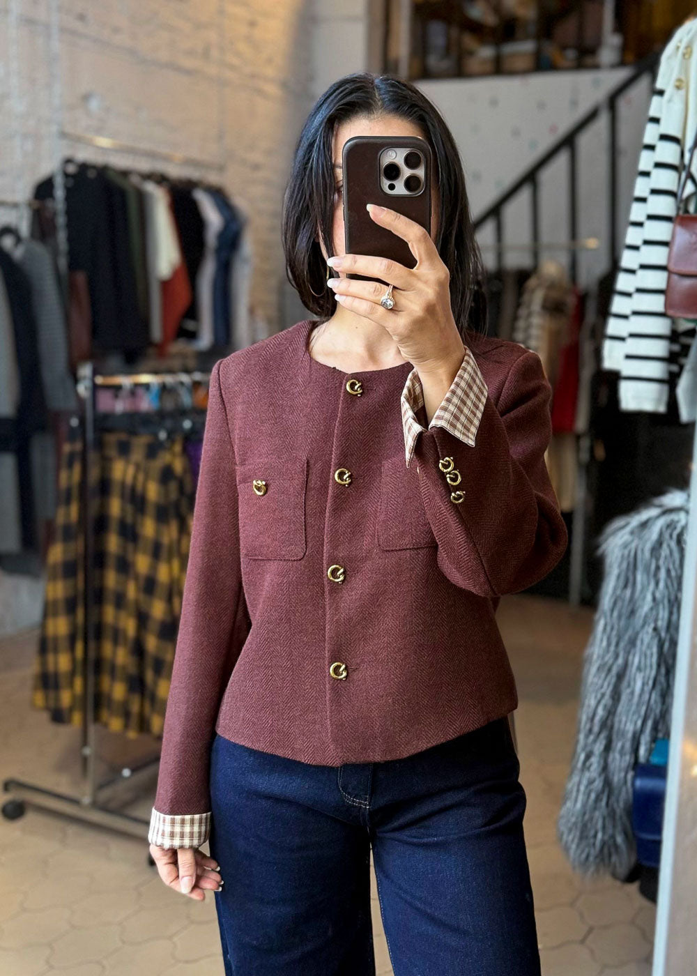 Jacheta scurtă "Margot" este o piesă versatilă, cu aer rafinat, ce aduce un plus de stil oricărei ținute smart-casual sau office. Este realizată dintr-un material cu ținută, care își păstrează forma, iar detaliile metalice aurii îi oferă o notă modernă și sofisticată. Croiala clasică, liniile curate și mansetele contrastante îi completează farmecul.