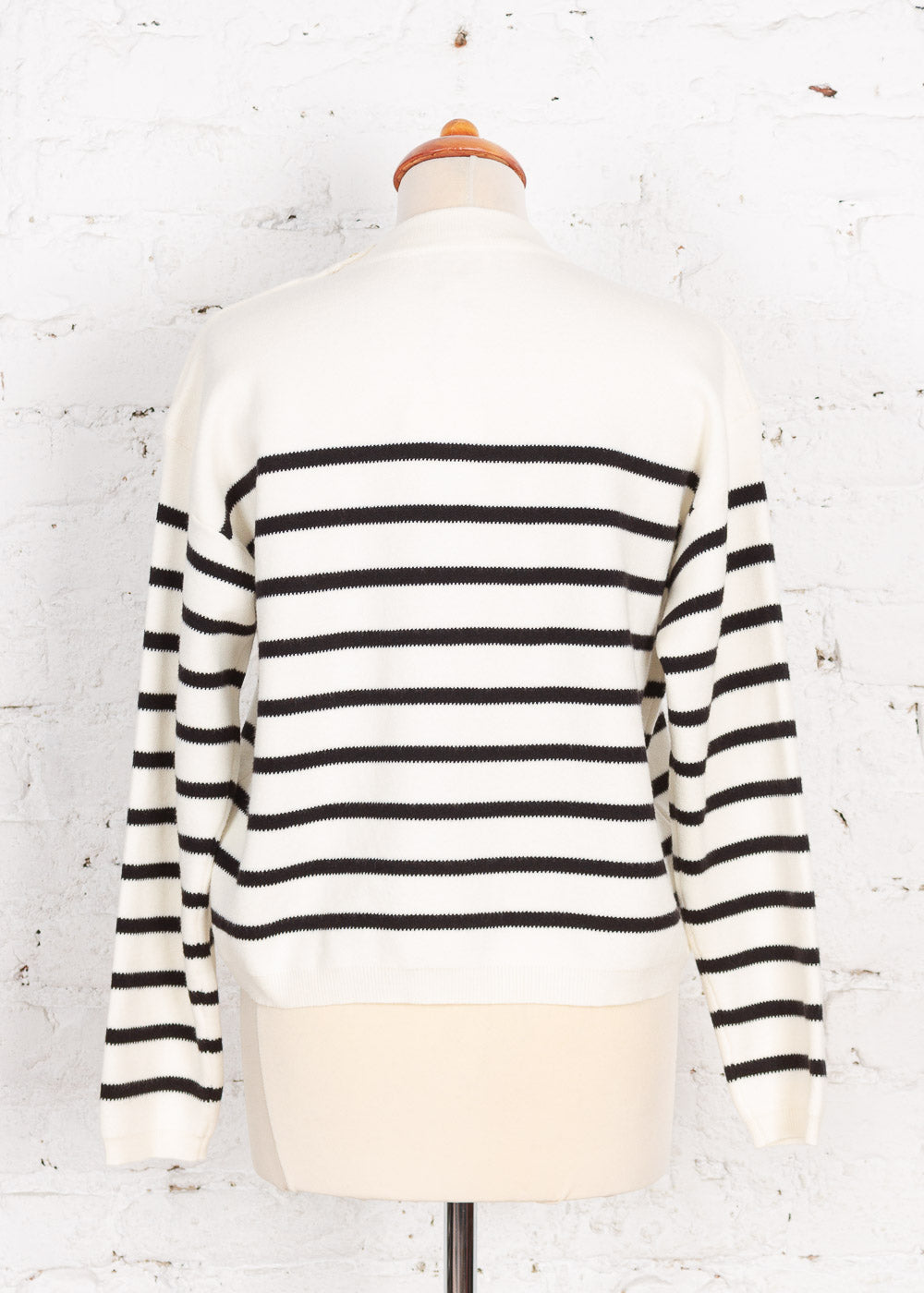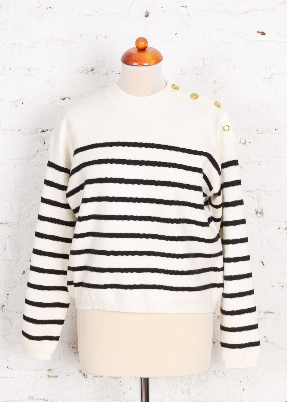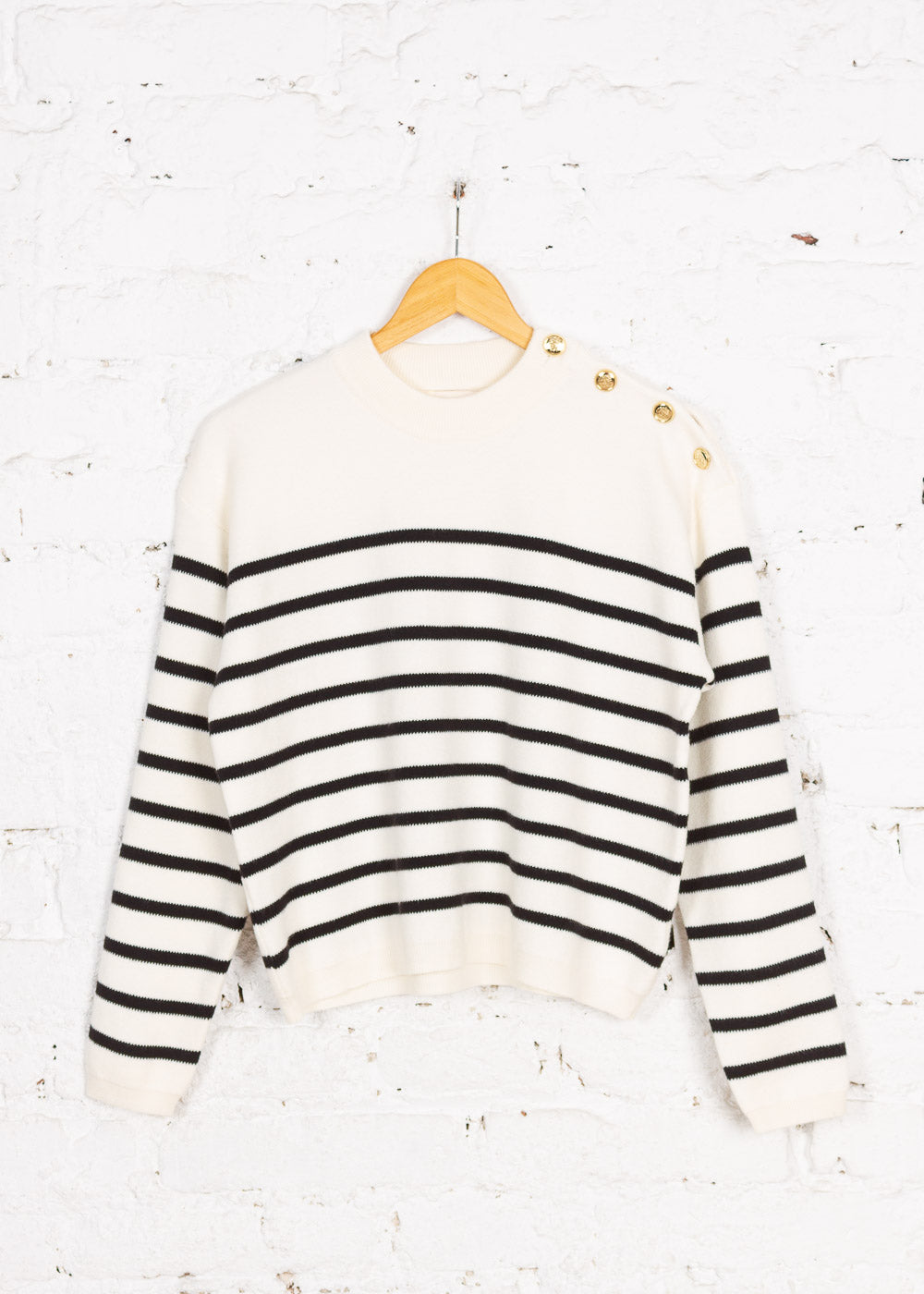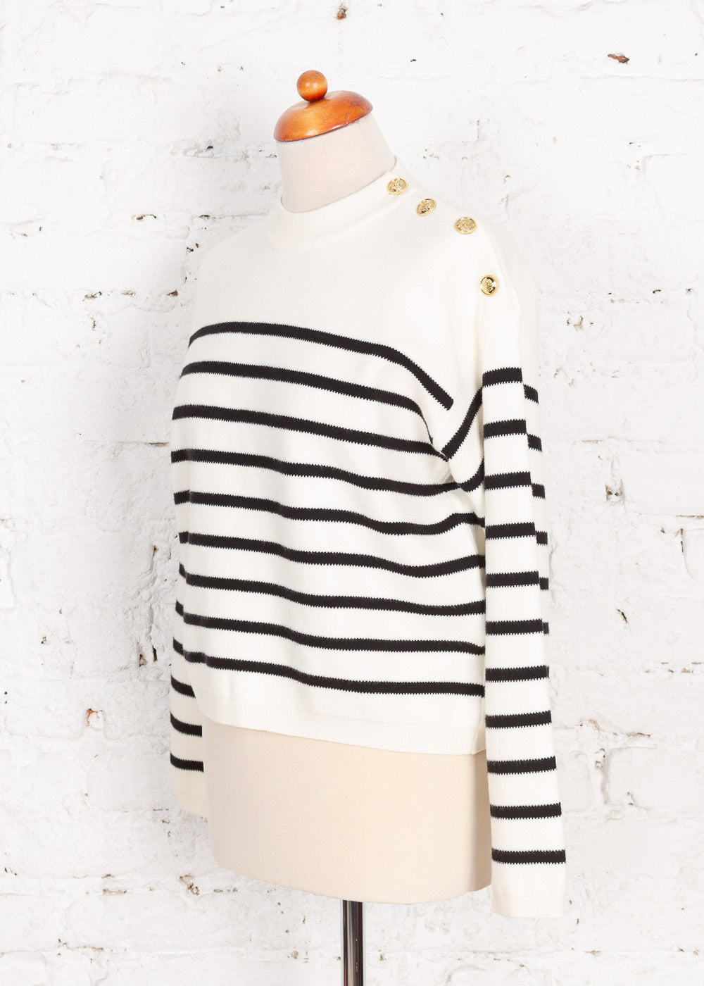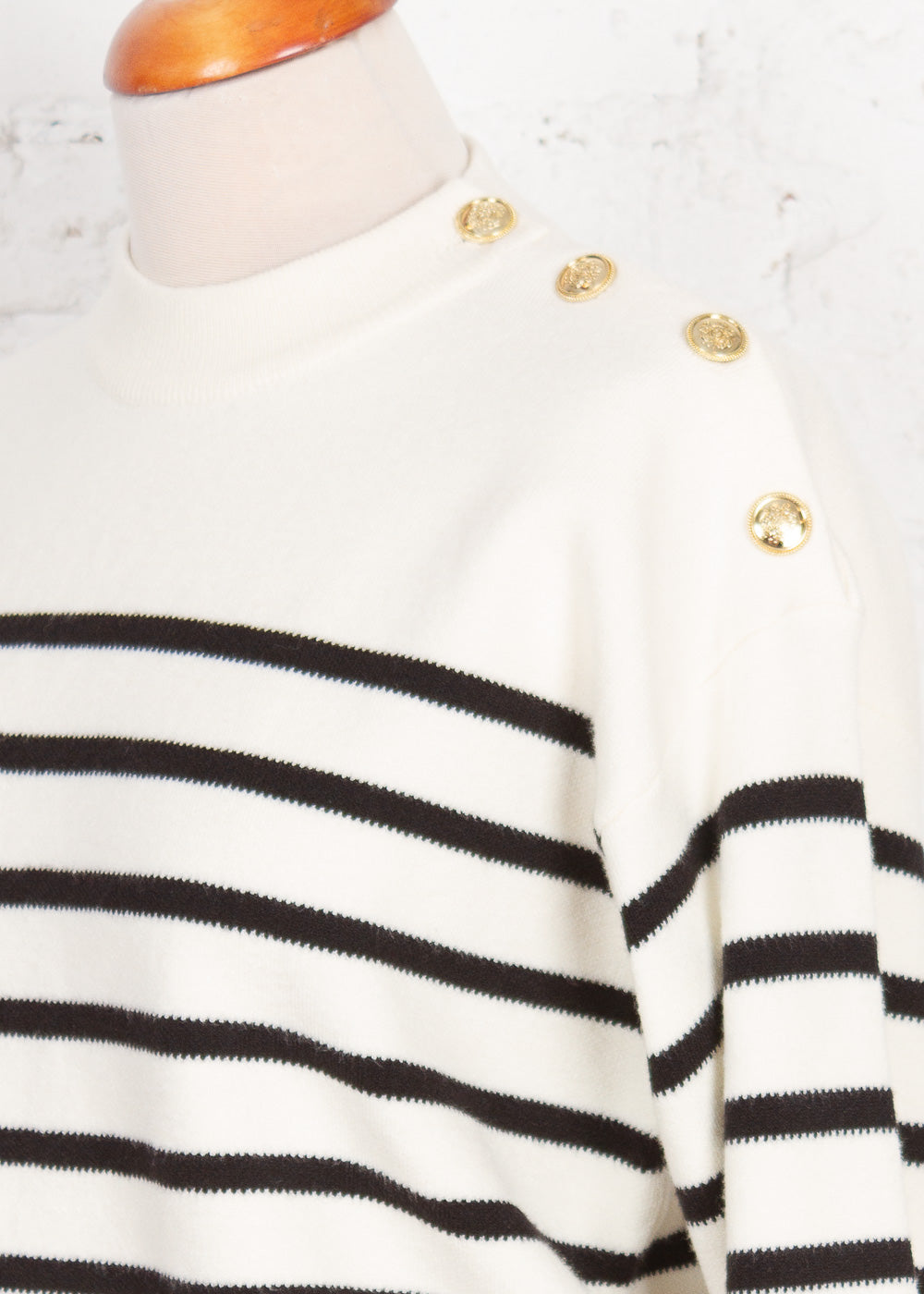 Puloverul din tricot cu dungi aduce o notă rafinată unui design clasic. Detaliul cu butoni metalici aurii pe umărul stâng îi oferă un aer modern și sofisticat, iar croiala relaxată îl face ideal pentru ținute confortabile și elegante de zi cu zi.