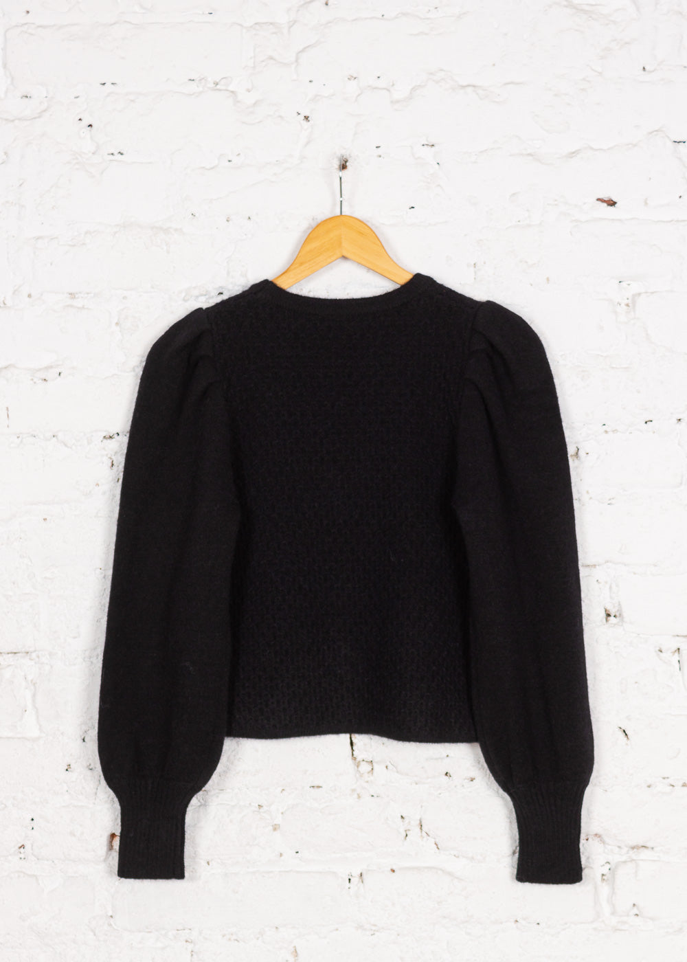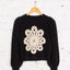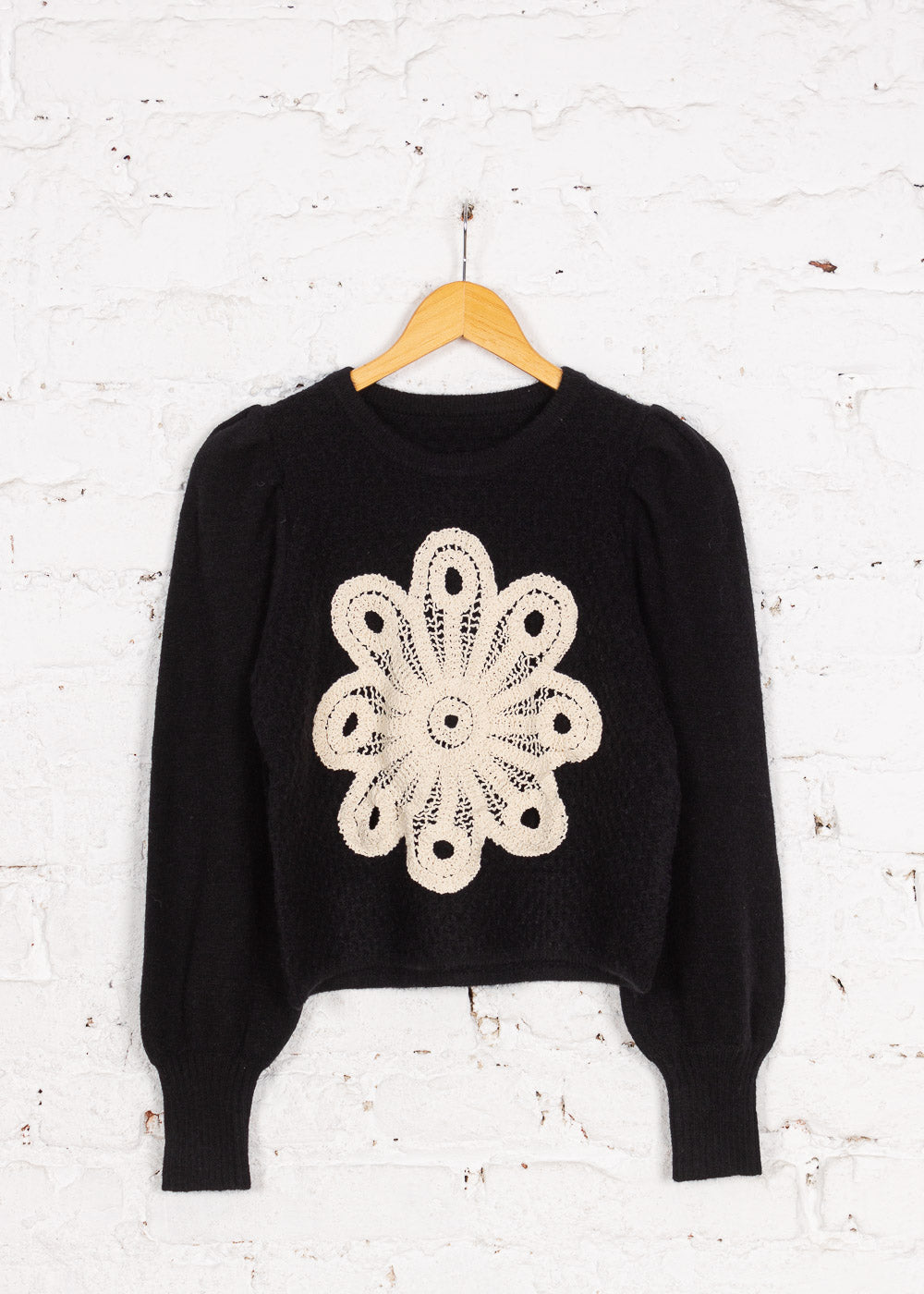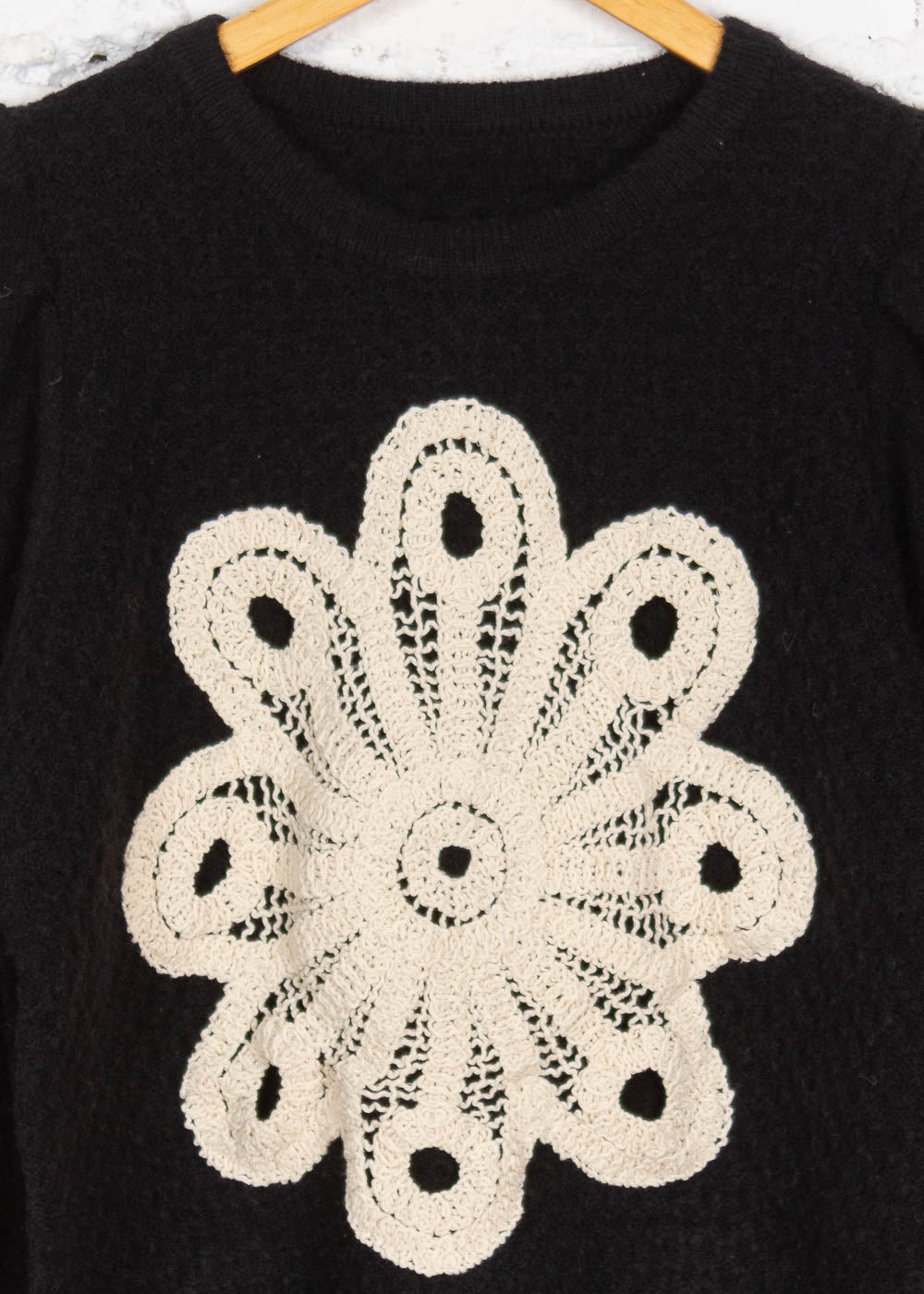 Puloverul din tricot cu model și floare croșetată aplicată pe piept adaugă o notă romantică și delicată ținutelor de zi cu zi. Croiala normală și detaliile feminine, precum umerii ușor bufanți și finisajele cu mansete, îl transformă într-o piesă versatilă și elegantă.