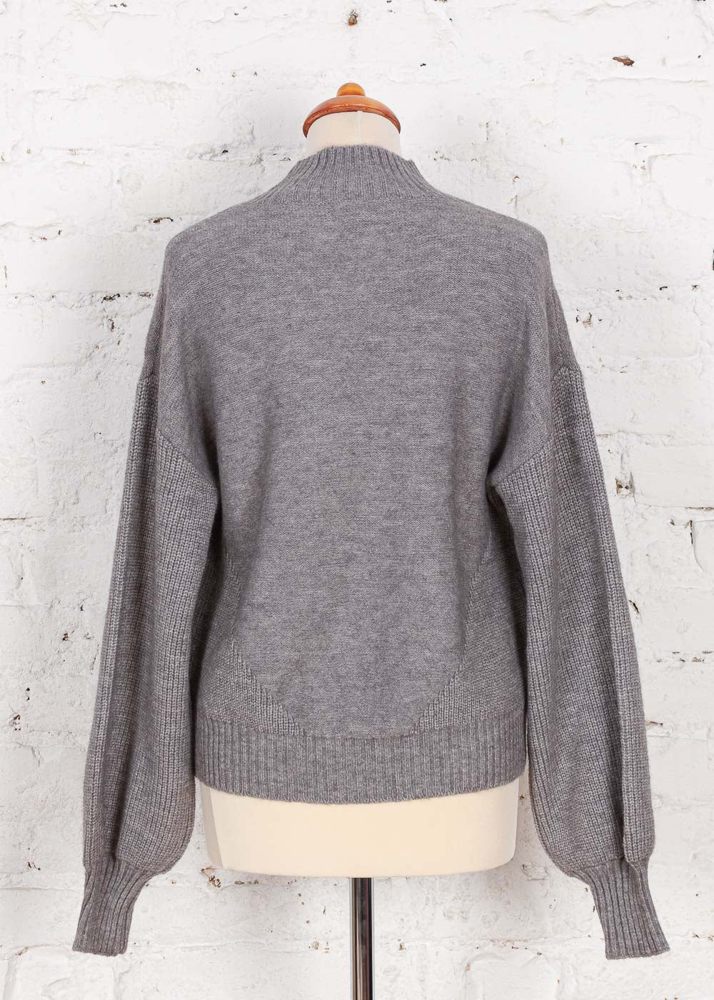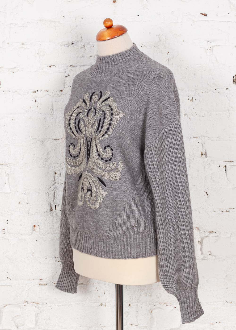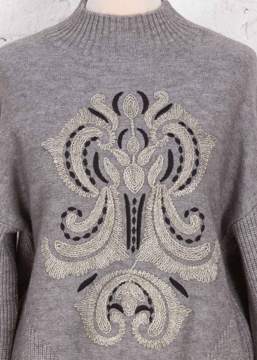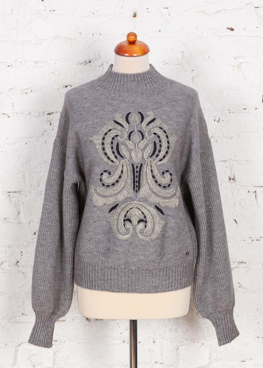 Pulover tricotat cu guler ușor înalt și broderie decorativă în față, ideal pentru ținute moderne și confortabile. Croiala relaxată și materialul cu lână aduc lejeritate și căldură. Disponibil pe gri și negru, în mărime unică, ușor de integrat în garderoba de zi cu zi.