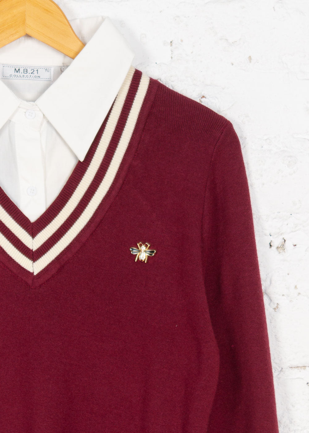 Puloverul tricot cu guler în V este alegerea ideală pentru un look smart-casual, elegant și confortabil. Designul său versatil cu guler și terminație tip cămașă integrată adaugă un aer rafinat oricărei ținute, iar brosa în formă de albină îi oferă o notă distinctivă și feminină.