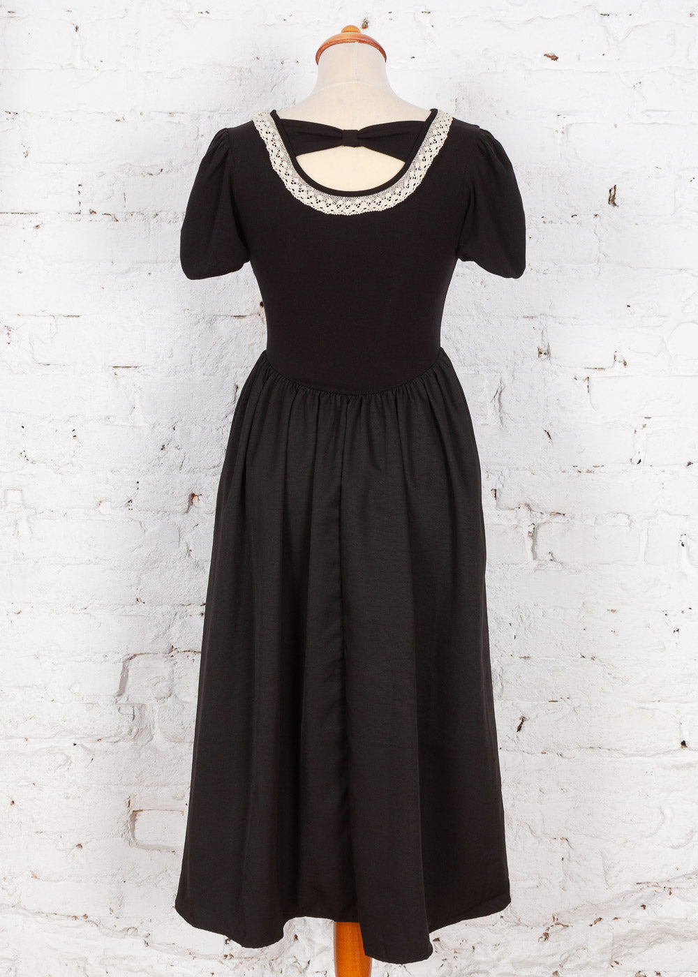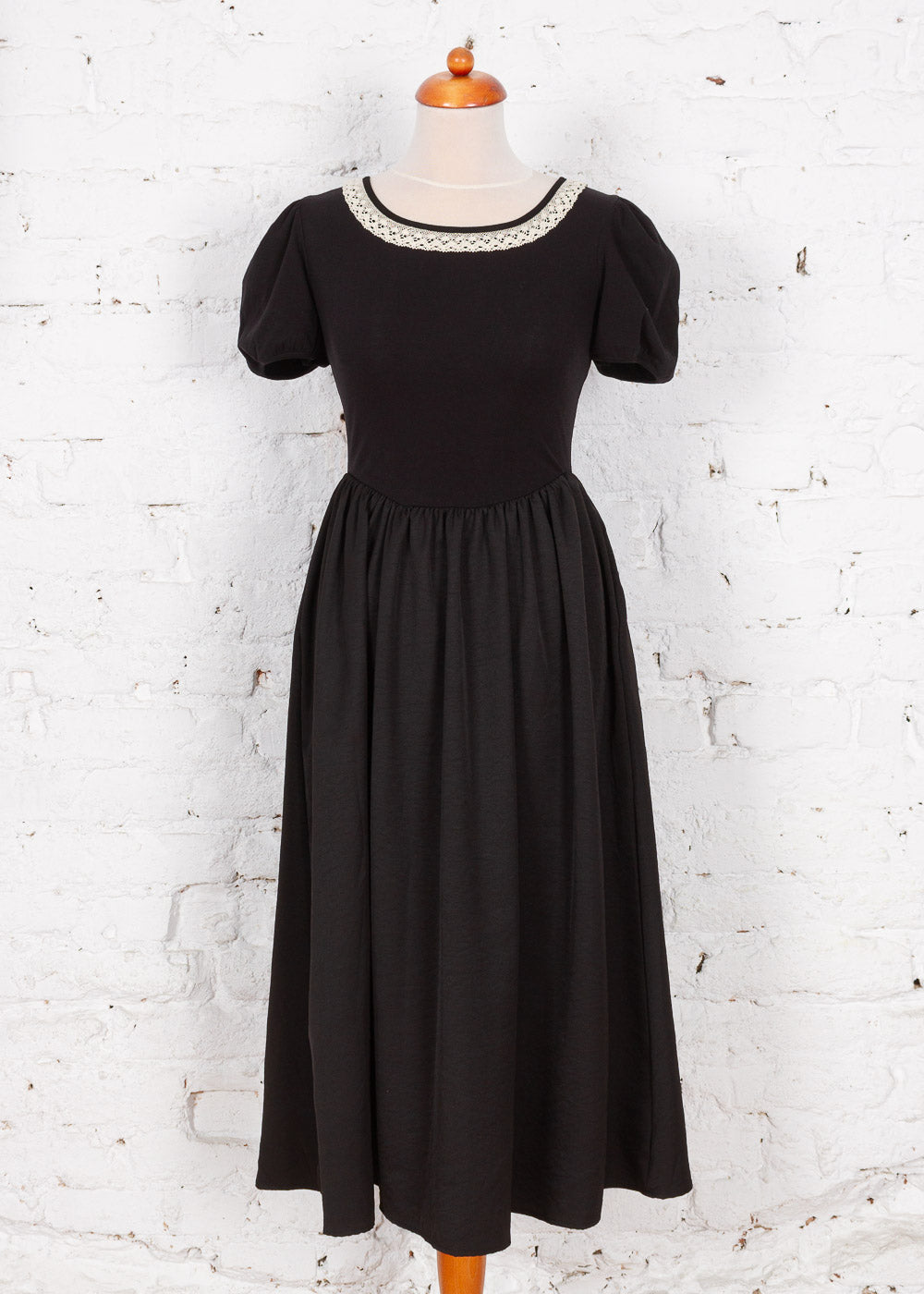 Această rochie neagră rafinată îmbină perfect confortul jerseului elastic cu eleganța unei fuste satinate. Gulerul decorat cu dantelă și decupajul delicat de la spate, accesorizat cu o fundă, adaugă un aer romantic. Este piesa versatilă ideală pentru evenimente speciale sau pentru o ieșire elegantă în oraș.
