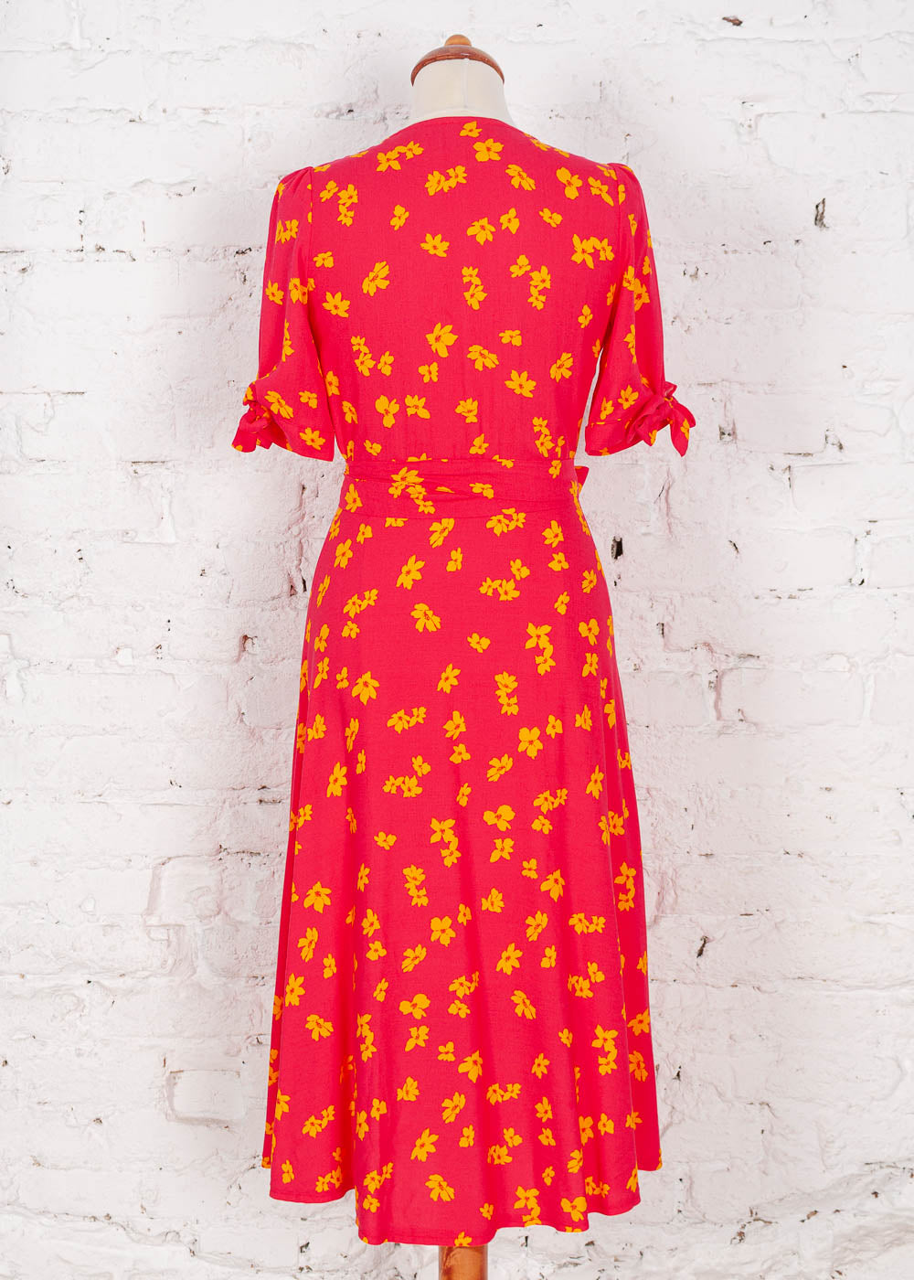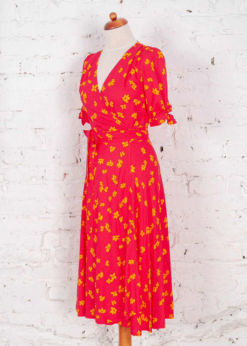 Rochie petrecută Faith din vâscoză roșie cu imprimeu