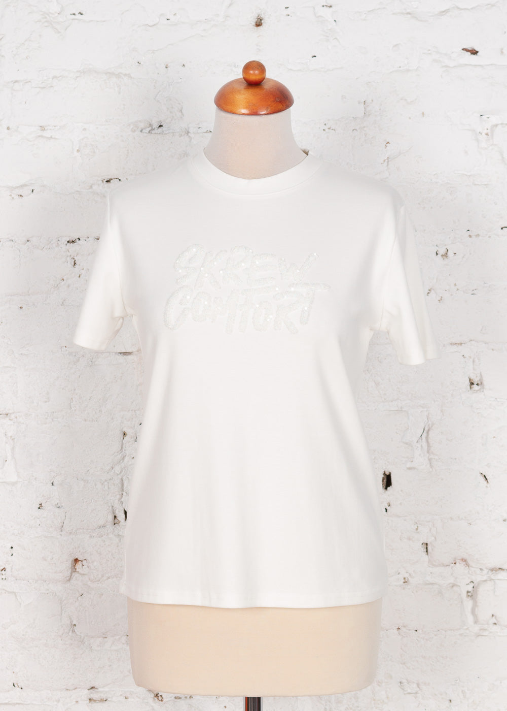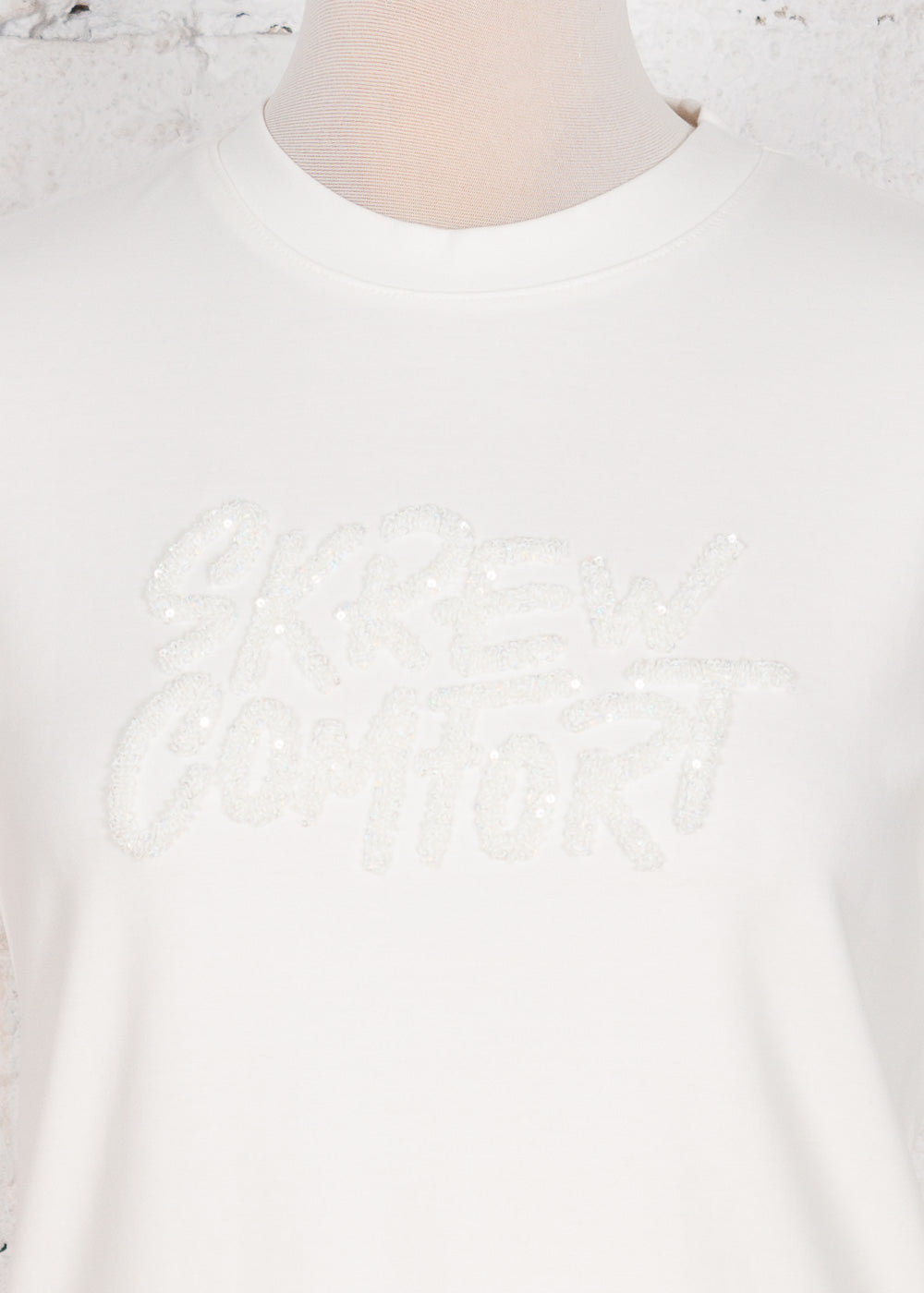 - Mesaj "skrew confort" realizat din paiete aplicate pe piept