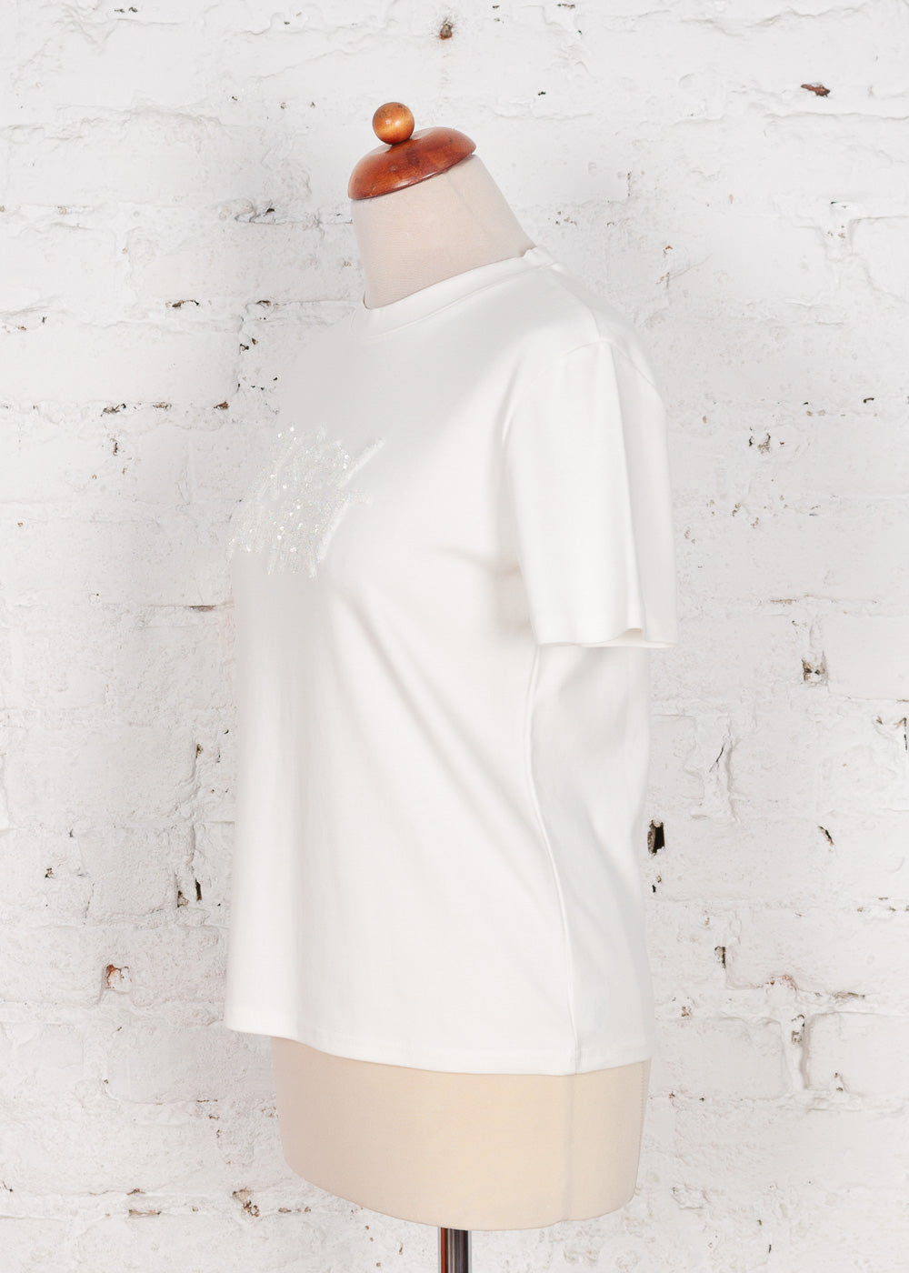 - Introdu parțial tricoul în talia pantalonilor pentru a marca discret silueta și a evidenția mesajul din paiete.